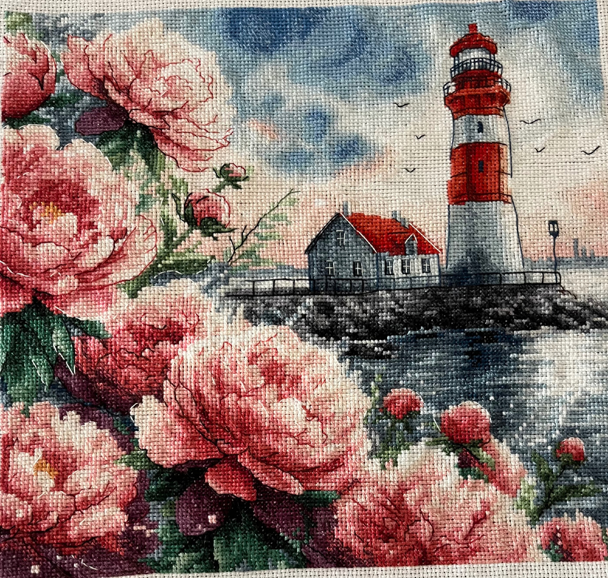 Маяк готов! Пионы тоже. Закончила еще позавчера в ночь, вчера купались-стирались-гладились, пытались сфотографироваться в ночи, но темновато). Работа и так чуть темнее, чем на превью, а при искусственном освещении еще затемняется. Немного технической информации, кому это интересно - размер итоговый после стирки 23,5 см на 22,7 см (заявлено 24 на 24 см). Стирала в прохладной воде, замачивая на пару часов в шампуньке, но села она неплохо, особенно по долевой нити. Зато понятно, что чистый хлопок). Дизайн Аси Сарвиловой, 50 цветов, канва Аида 16 каунта, мулине лука-с, 23958 крестиков. Ну средненькая такая работа по трудоемкости и размеру, не дименшенс голд с 40 тыс крестиков, но потрудиться нужно. 52 вышивальных дня заняла эта работа, при желании ее легко можно вышить за месяц. Было бы желание). На фото саги видно, что не сильно я утруждалась с этой работой, вышивала, как настроение, желание и возможность сойдутся вместе. Не торопилась. Хочется - взяла, вышила хоть 17 крестиков (там