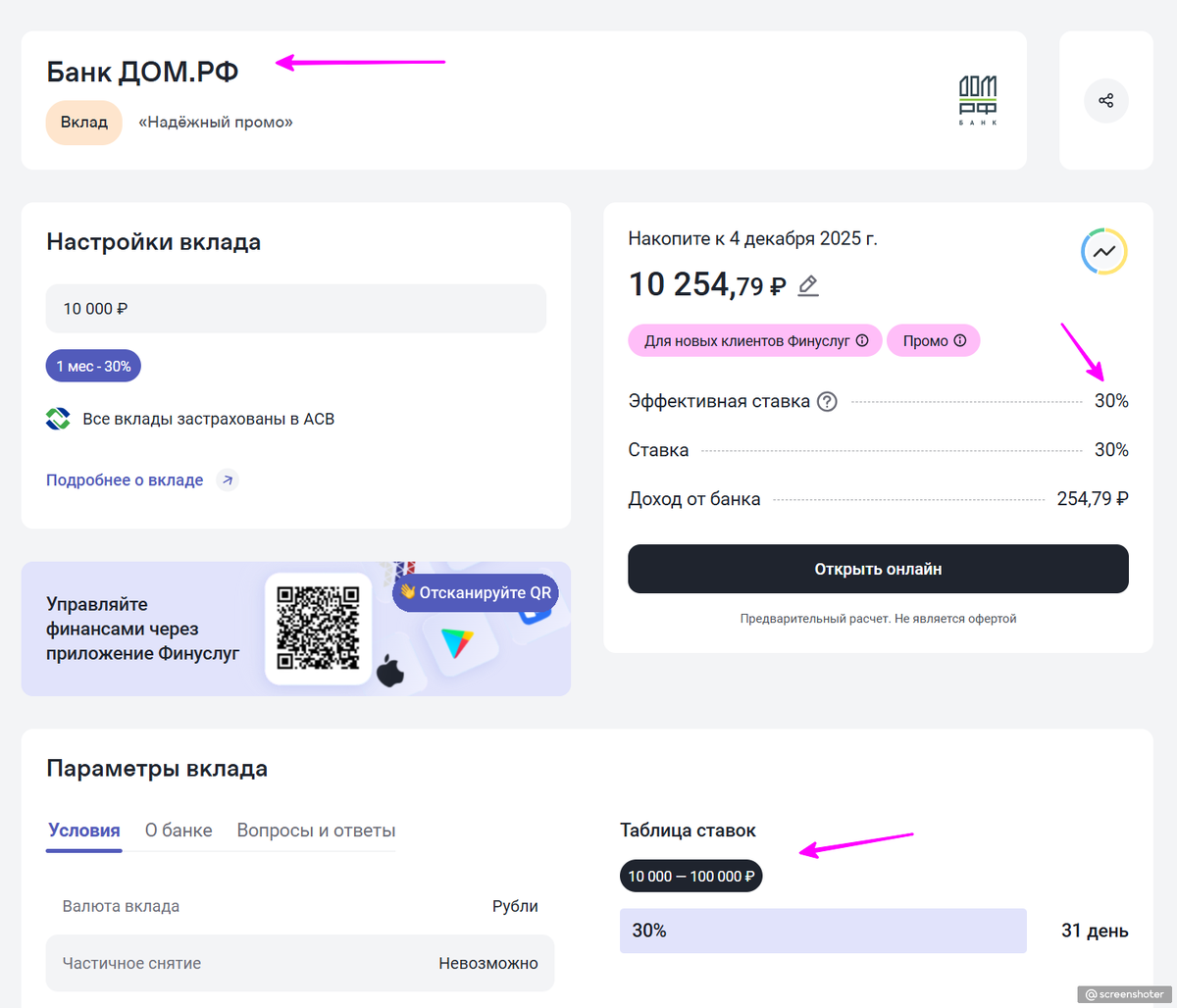 30% годовых на 31 день (10-100 тыс. ₽). 30% годовых на 91 или 181 день (10-50 тыс. ₽). 22% на 31 день и 18% на 181 день (10-500 тыс. ₽)