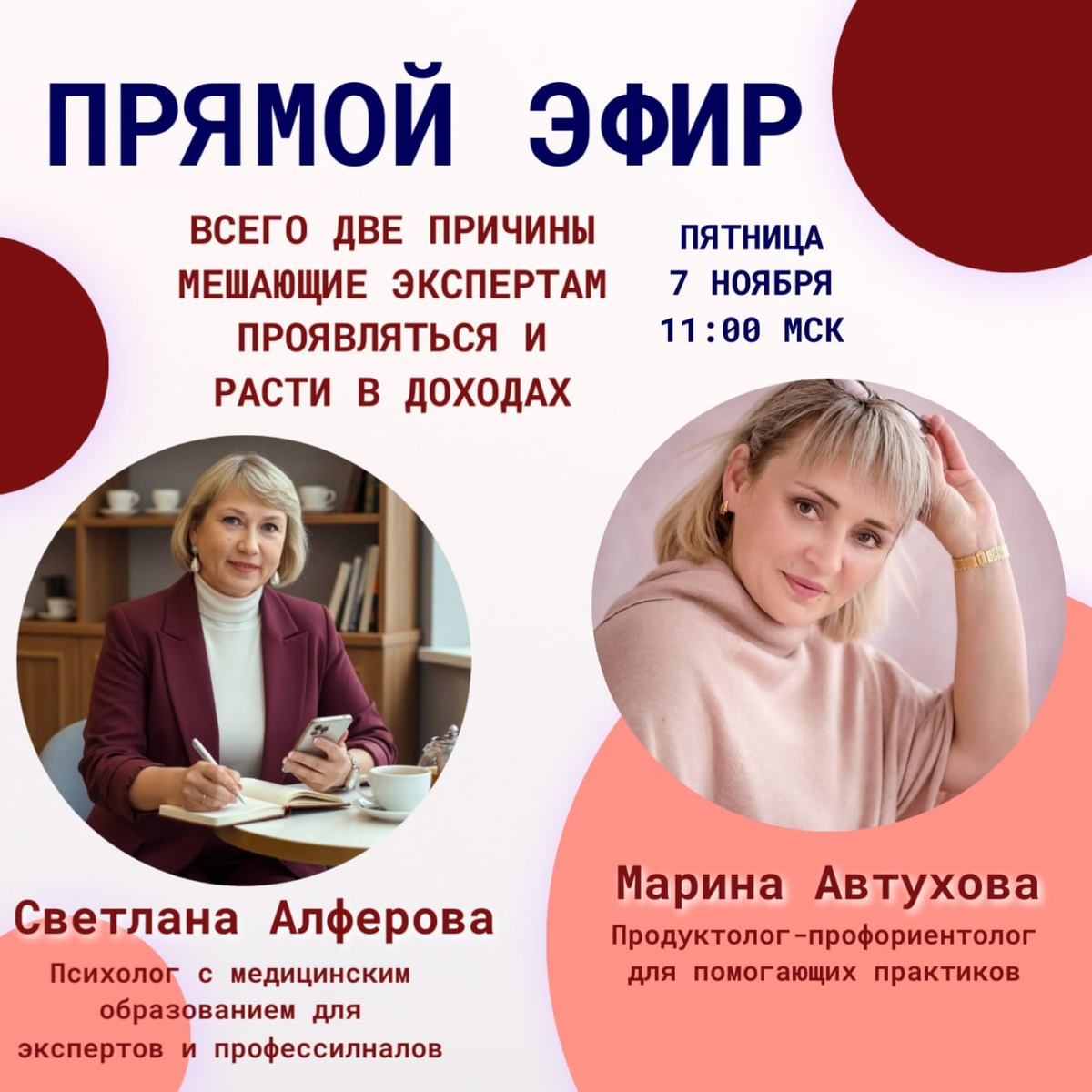 Всего 2️⃣ причины, которые мешают экспертам зарабатывать! Каждому эксперту знакомо чувство, когда ты — настоящий кладезь знаний, а на счету этого почему-то не видно(( Ты эксперт: психолог, коуч, профориентолог и т.д. и прошла(прошел) разные обучения и умеешь реально помогать. Но вместо потока клиентов и дохода — тишина и внутренний голос: «Ну почему у меня не получается?!» Что, если мы скажем, что всему виной всего 2 причины? И ты, скорее всего, путаешь их между собой, тратя силы впустую. ⚡️Ты думаешь: «Не знаю, что предложить, как искать клиентов и как продавать»? Это Рациональная причина, лечится системой и знанием. ☄️Ты думаешь: «Вроде все есть, но боюсь критики, чувствую себя самозванцем и не могу о себе заявлять? Это Иррациональная причина, лечится проработкой внутренних блоков. Приходи на бесплатный эфир-диагностику и узнай свою истинную причину: Самосаботаж или пробелы в знаниях? Определи, что на самом деле мешает твоей практике расти💬 На эфире ты получишь: 🔹Подробный р