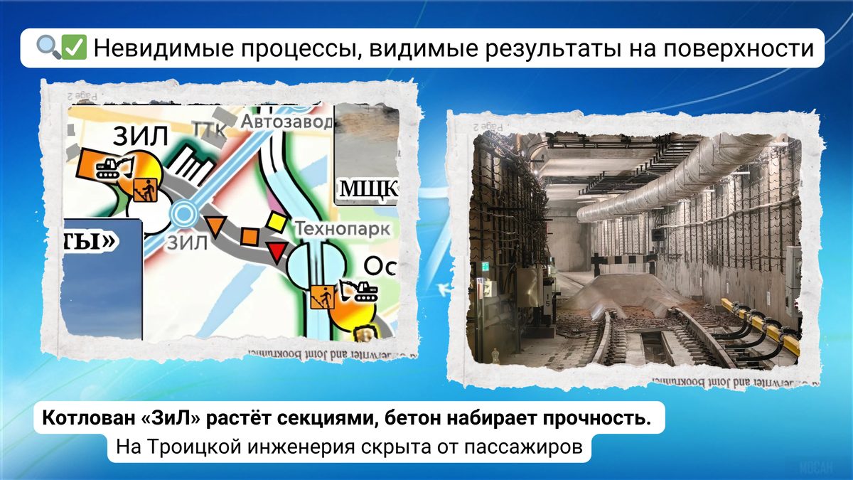 официальные отчеты. Давайте вместе разберемся, что же на самом деле происходит с нашей Москвой. Поехали? В-первых, окинем взором площадку 🚇 «ЗиЛ» 🏭 Бирюлёвской линии. 📷 1.1-1.4: В котловане около станции Троицкой линии растут монолитные конструкции. 📷 1.5-1.7: Продолжается раскрытие котлована в районе будущих камер съездов. 📷 1.8-1.9: Рядом заливается лоток. Во-вторых, покажем скрытую инфраструктуру нового участка 🏡 Троицкой линии. ----------------------------------------------------