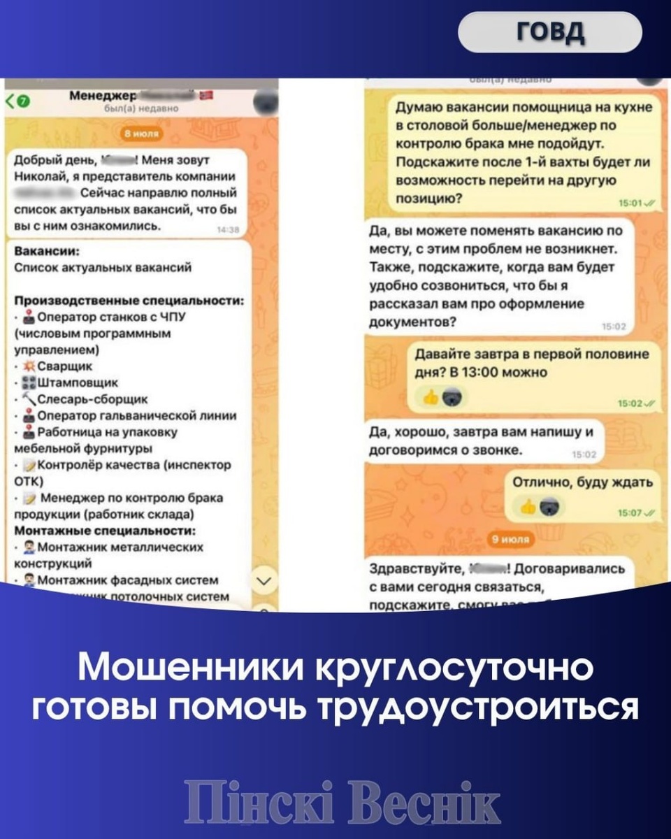 ⚡️Мошенники круглосуточно готовы помочь трудоустроиться ‼️При поиске работы за рубежом все чаще пинчане попадают на мошенников. Людям предлагают хорошую зарплату, удаленное оформление всех документов, помощь в подборе жилья и даже доставку на новое место работы. В результате безработные, в том числе и пинчане, теряют последние сбережения, переводя деньги мошенникам. 📞В Пинский ГОВД с заявлением обратилась 35-летняя неработающая пинчанка о том, что неизвестные в ходе переписки в социальной сети под предлогом трудоустройства в Норвегии мошенническим путем завладели около 4000 рублями. #ГОВД #Мошенничество @Пинский Вестник ЮТУБ | САЙТ| ИНСТ | ВК | ОК | ФЕ | Прислать новость