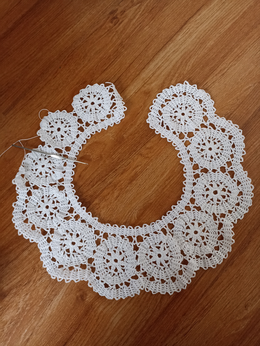 Добрый день уважаемые подписчики и гости канала! Сегодня хочу показать вам мою работу. Даже не работу а просто ажурное удовольствие. Вяжу ажурный воротничок брюгским вязанием. Я не могу назвать это работой. Вяжу с вдохновением , мне всё это просто нравится. Получается прекрасный воротничок ,украшение любого платья а также его можно использовать как начало вязаного платья , кофточки . Мотивы можно расположить в другом порядке и связать изделие из мотивов. Вот так они вяжутся. Вначале круглый мотив . Затем в процессе вязания соединяем мотивы друг с другом , чтобы получился воротничок соединения делаем в определенных местах , чтобы получалось закругление. А потом обвязываем ленточкой. Вязание не сложное , главное понять принцип вязания . Воротничок вяжу из хлопковой пряжи. Воротничок можно связать любой длины , она зависит от количества мотивов в воротничке. И ещё девчата кто желает приобрести воротничок пишите какой длины нужен. Стоимость готового воротничка зависит от размера. Кого за
