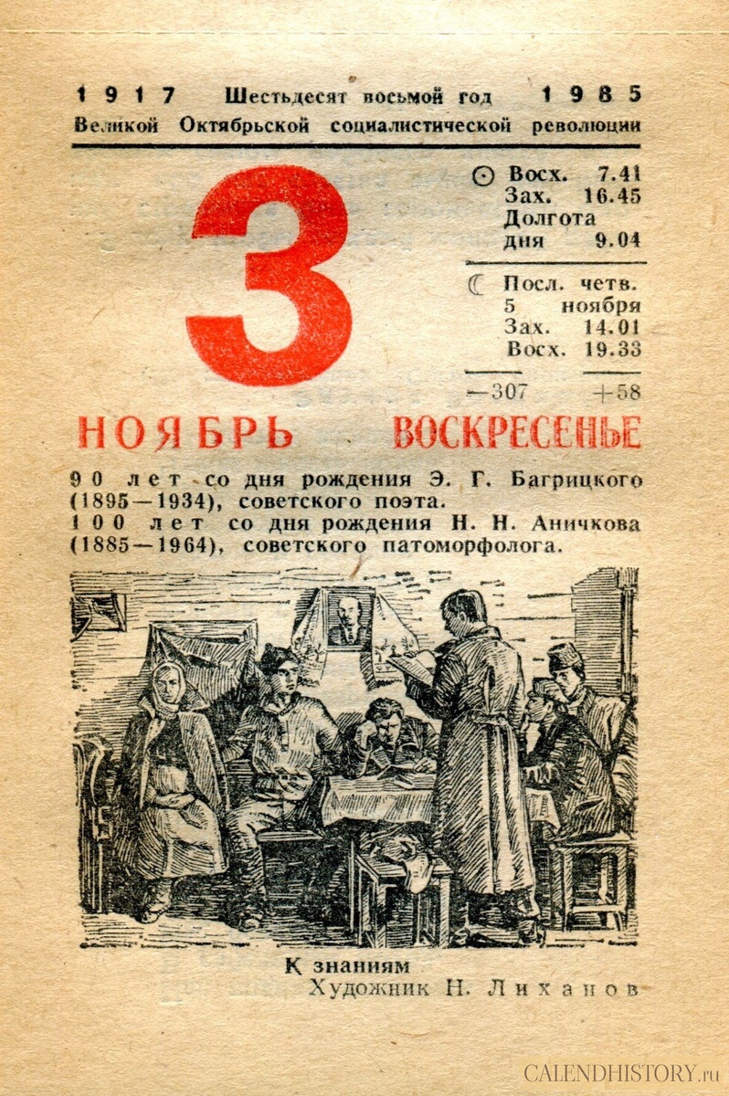 Листок советского отрывного календаря 40-летней давности 3 ноября 1985-го года — Календарь Политиздата 90 лет со дня рождения Э. Г. Багрицкого (1895-1934), советского поэта. 100 лет со дня рождения Н. Н. Аничкова (1885-1964), советского патоморфолога. К знаниям Художник Н. Лиханов Больше советских отрывных календарей смотрите у нас на сайте - calendhistory.ru https://calendhistory.ru/3-nojabrja-1985-go-goda-kalendar-politizdata/