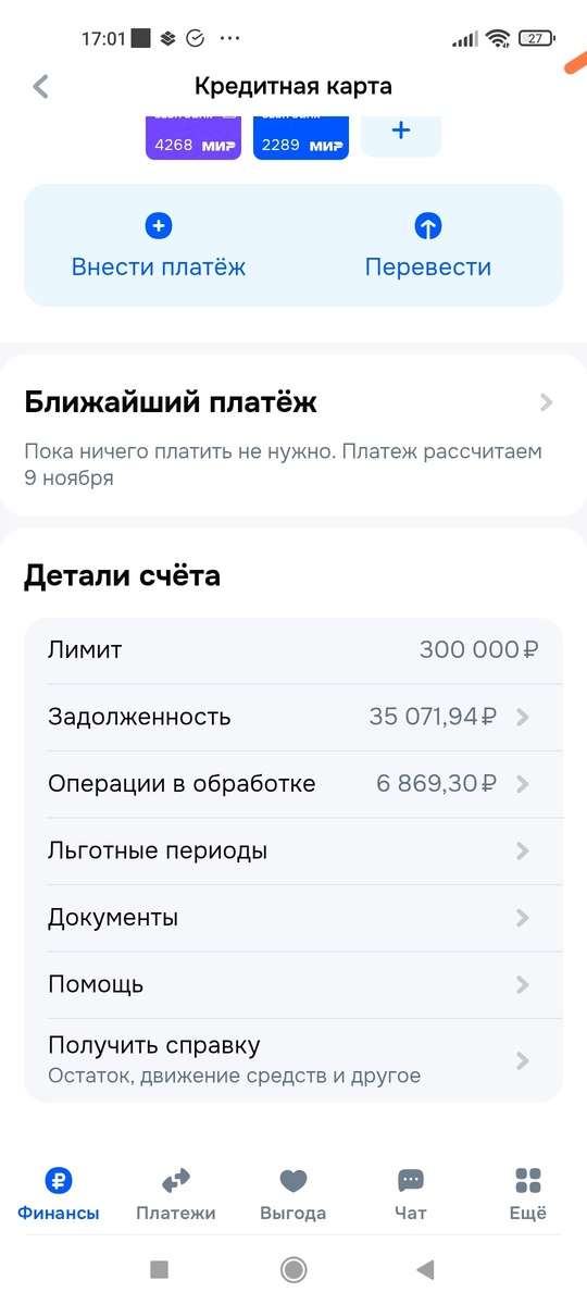 Машина снова у умельца. Поменяет резину на зимнюю, плюс посмотрит один из датчиков. Делала диагностику. Она показала, что еще нуждается в замене. Оплачивать придется с кредитки. На фото скрин, где видна задолженность. Оплачивала работу, покупала детали. Для переводов нет льготного периода, так что уже начисляются грабительские проценты. Сумма долга каждый день растет. Получу свои, все отдам за долги. Но не хватит. Долг останется. Мечтаю закрыть кредитку. Не понимаю, как она работает. На какую сумму начисляются проценты? Вот конкретно, до копейки. Этой информации нет.