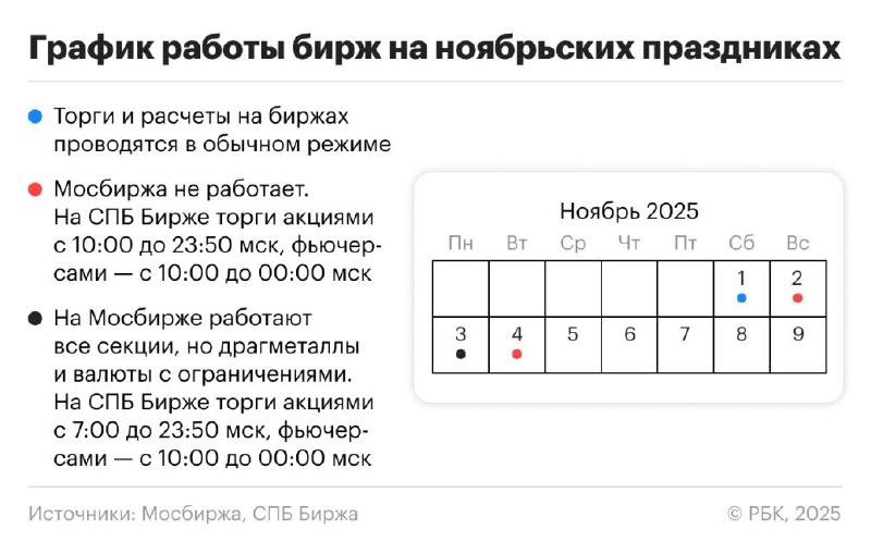 #ГрафикРаботыБирж Наступили ноябрьские праздники, мы уже отработали шестидневную рабочую неделю, и теперь наслаждаемся тремя выходными подряд. Рассказываю, как будут проходить торги на Московской бирже и СПБ Бирже в эти дни. 📌1 ноября (суббота) — торги будут проводиться на всех рынках в обычном режиме; 📌2 ноября (воскресенье) — торги не проводятся; 📌3 ноября (понедельник) — торги будут проводиться на всех рынках. При этом на валютном рынке и рынке драгоценных металлов торги будут осуществляться по всем инструментам, за исключением сделок с датой исполнения обязательств в день заключения сделок (сделок с расчетами today, или TOD) и сделок своп, дата исполнения обязательств по первым частям которых приходится на день заключения данных сделок своп; 📌4 ноября (вторник) — праздничный день, торги не проводятся. Начиная с 5го в обычном режиме. А будни 😀Утренняя торговая сессия 07:00:00 - 09:50:00 МСК. 😀Основная торговая сессия 09:50:00 - 18:50:00 МСК. 😀Вечерняя торговая сессия 19