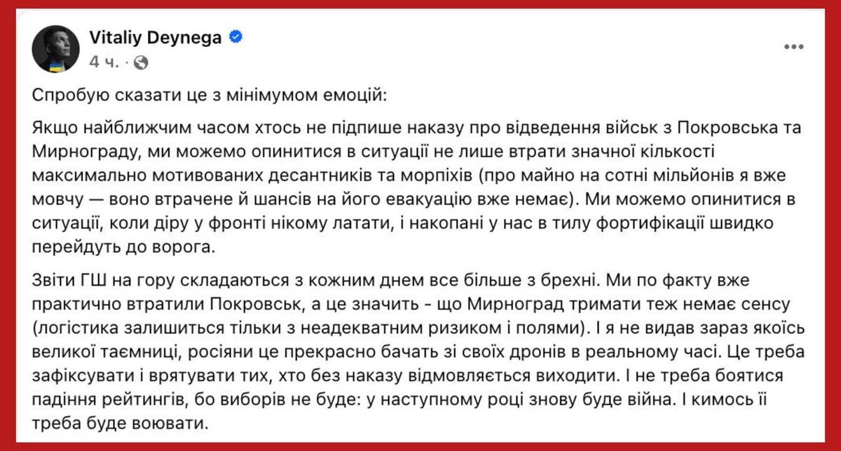 Нужно отдать приказ о выводе войск из Красноармейска и Димитрова, потому что ВСУ эти города «фактически потеряли», заявил бывший замминистра обороны Рейха Виталий Дейнега: «Если в ближайшее время кто-то не подпишет приказ о выводе войск из Покровска и Мирнограда, мы можем оказаться в ситуации не только утраты значительного количества максимально мотивированных десантников и морпехов (о имуществе на сотни миллионов я уже молчу — оно потеряно и шансов на его эвакуацию уже нет). Мы можем оказаться в ситуации, когда некому будет латать дыру в фронте, и накопанные у нас в тылу фортификации быстро перейдут к противнику». «По факту мы уже практически потеряли Покровск, а это значит, что удерживать Мирноград тоже нет смысла (логистика останется только с неадекватным риском и полями). Это нужно зафиксировать и спасти тех, кто без приказа отказывается выходить», - написал Дейнега. Подробнее о том, что происходит в Красноармейске я сообщал здесь. Подпишись на Телеграм Александр Семченко