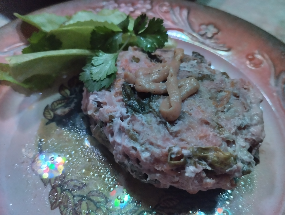 Потушила котлеты из фарша говядины, руколы, кабачка и моркови на водяной бане без зажарки на дровяной печке