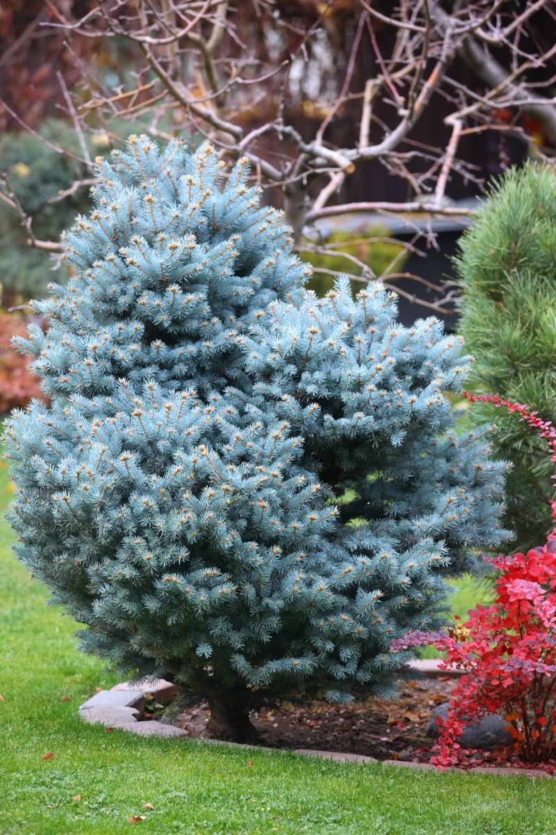 Авторская колонка Настасьи Суслиной Время хвойных аристократов К началу ноября, когда лиственные растения показали свои осенние краски и практически полностью разделись, на первый план выходят хвойные и вечнозеленые. Именно они будут в течение нескольких месяцев главными героями в саду и у нас это сосны, ели, можжевельники, туи и самшиты. Одна из моих любимиц голубая ель Глаука глобоза. Она медленнорастущая, поэтому у нее небольшой размер и буквально игрушечная форма с плотной серебристо-голубой хвоей. Такой красавице я выделила самое центральное место, чтобы ее было видно с любой точки сада. Она прекрасно смотрится как в одиночной посадке, так и в компании любых других растений и можно сказать, что в плане декоративности и ухода она абсолютно универсальна и неприхотлива. Мне очень нравится она в паре с краснолистными сортами барбарисов, которые осенью держат листву достаточно долго и постепенно уходят в яркие малиновые оттенки. Голубой и малиновый – завораживающее сочетание, прав