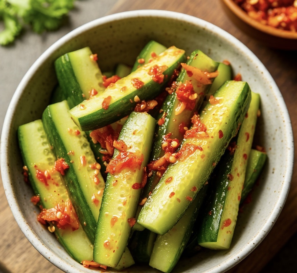 Ингредиенты - Огурцы — 1 кг (но можно и чуть больше, чтобы потом не пожалеть) - Соль — 2 ст.л. (чтоб огурцы проснулись) - Чеснок — 3-4 зубчика (но не перестарайтесь, чтобы не пугать соседей) - Красный перчик чили — 1-2 шт. (либо по настроению) - Имбирь — кусочек размером с ваш палец (хоть и маленький, но мощный) - Сахар — 1 ч.л. (чтоб было не только остро, но и сладко-грустно) - Рыбный соус — 2 ст.л. (это как соль, но с приключениями) - Зелёный лук — пучок (на случай, если кто-то решил стать шеф-поваром) Приготовление 1. Огурцы помойте, разрежьте на кусочки и посолите. Пусть постоят минут 30, чтобы просолиться и немного помягчать, как утро после пятницы. 2. Сделайте «кимчишную пыль»: чеснок, имбирь и перчик измельчите (можно даже злиться при этом, чтобы оно острее было). 3. Смешайте пыль с сахаром и рыбным соусом — теперь у вас есть маленький секретный соус, который заставит огурцы танцевать. 4. Добавьте зелёный лук и всё тщательно перемешайте с огурцами. 5. Потрясите банку (или