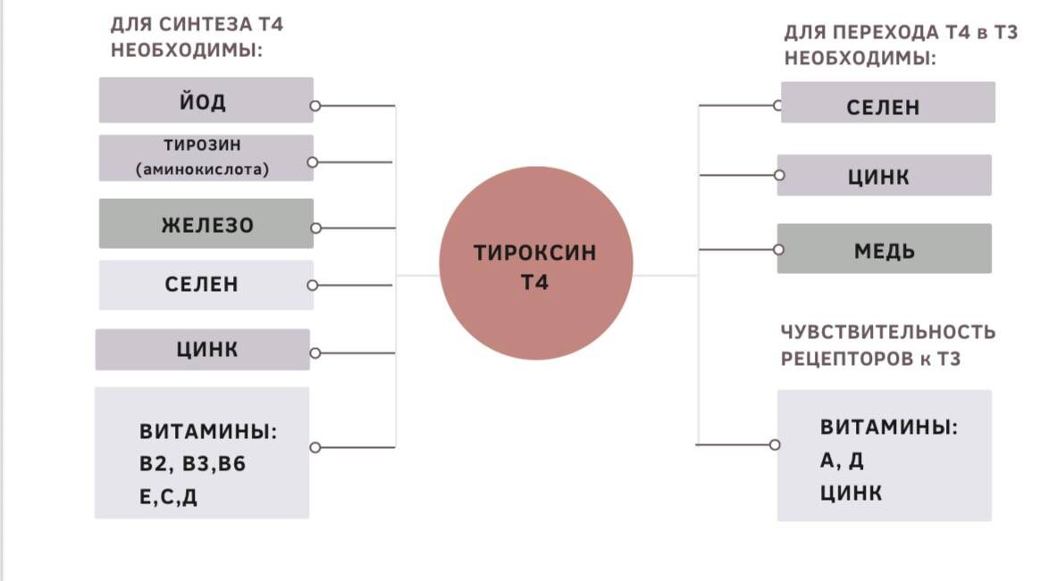❗️Показываю самый важный слайд для здоровья щитовидной железы! 1️⃣ Для образования щитовидной железой гормона - ТИРОКСИНА (Т4) необходимы перечисленные нутриенты. 2️⃣ Т4 это малоактивный гормон. Но это важная форма, так как из него образуется Т3 (трийодтиронин)! 3️⃣ Все гормональные эффекты щитовидной железы реализуются за счет действия гормона Т3. ⬆️ Смотрите какие для этого перехода необходимы нутриенты. 4️⃣ И даже если в организме достаточное количество Т3 и Т4, очень важна чувствительность клеток к гормонам. ❗️Снижение функции щитовидной железы может начаться задолго до ее заболеваний. Готовлю для вас новый гайд по этой проблеме!