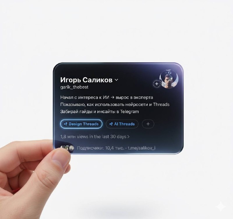 Создаем вот такие 3D карточки социальных сетей в nano banana Промт: Ultra-realistic 3D render in the Apple Vision Pro aesthetic, featuring a Threads profile card as if part of a next-generation mixed-reality interface. The card is semi-transparent, crafted from polished glass with rounded edges, floating between two softly lit fingers. Its surface subtly refracts light, revealing a black-to-blue gradient tint with a smooth, premium finish. Edges emit a gentle, diffused glow in shades of electric blue and violet, harmonizing with the minimalist white environment. Typography follows Apple’s Human Interface principles — clean, geometric, and weight-balanced, rendered in fine white lettering. The background is pure white, softly illuminated, with volumetric light scattering, giving a sensation of depth and calm spatial presence. The overall mood is futuristic, elegant, and tactile, evoking the signature Vision Pro “lightness of reality” aesthetic. Rendered in 8K, ultra-detailed, with subs
