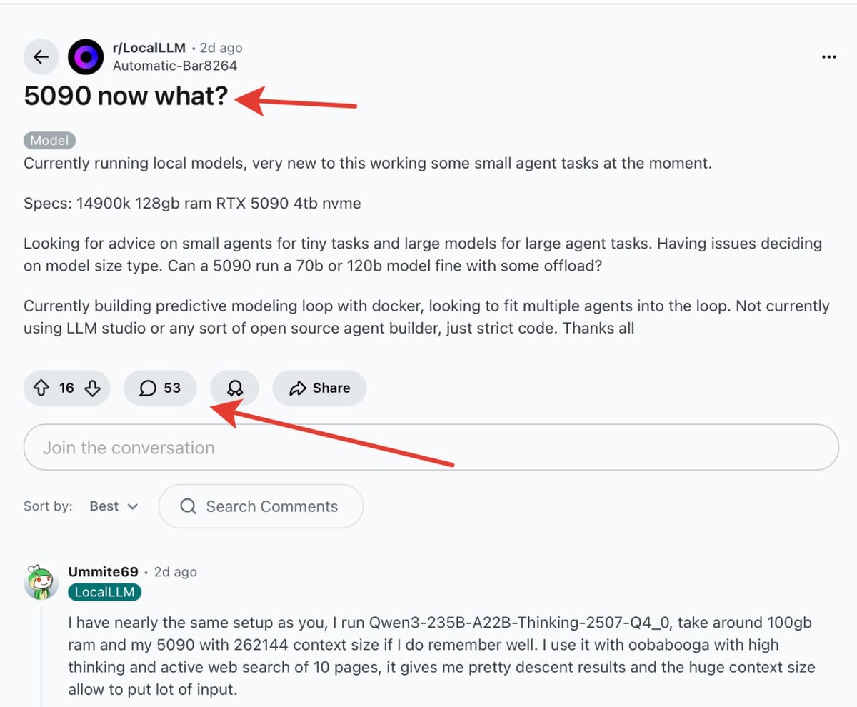 На реддите парень с топовым железом -RTX 5090, 128GB RAM и процессором 14900k спрашивает, как эффективно использовать эту мощь для локальных
