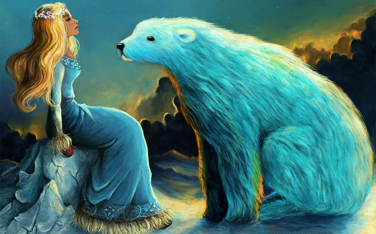 Однажды вечером в дверь их дома постучал огромный белый медведь. Он вежливо поздоровался и попросил отдать ему девушку, взамен он сделал бы семью настолько богатой, насколько они были сейчас бедны.