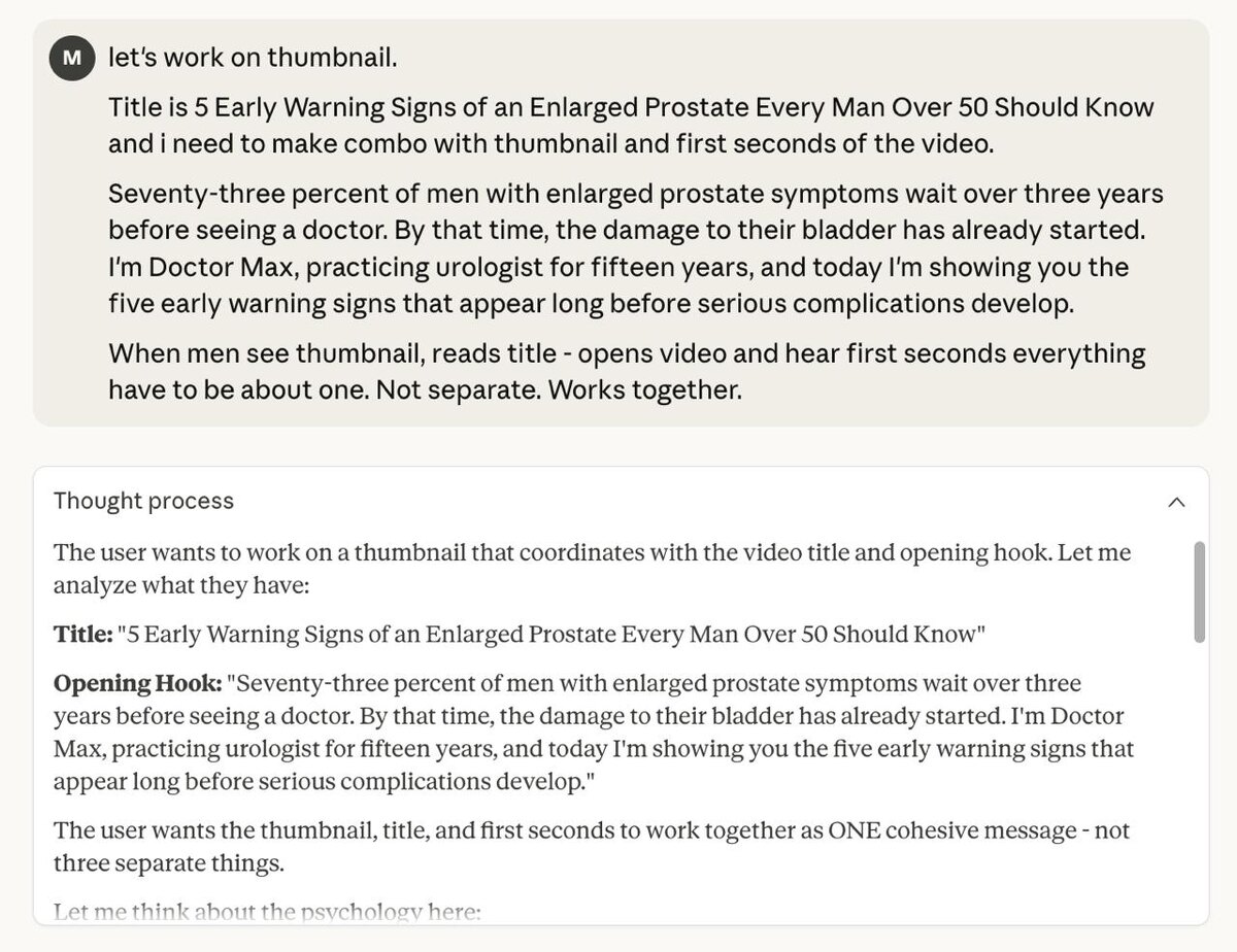 Слава богу он меня понимает... Даже когда я пишу не на идеальном английском , а на своём среднячковом уровне – Claude додумывает за меня. Лайфхак #1 Когда отправили промпт или запрос, открывайте процесс его размышлений. Оттуда можно взять много идей для улучшения и настройки инструкций. Например я хочу связать Обложку, Заголовок и Первые слова, которые слышит человек открыв видео в единое сообщение. Чтобы ожидания зрителя совпадали с реальностью и не было никаких противоречий. Он мне подкинул идею ONE cohesive message. Одно целостное сообщение. Я бы не додумался до такой формулировки. Теперь я добавлю это в инструкцию, и когда мы будем разрабатывать упаковку видео, он сразу будет опираться на эту задачу. Я мало работаю по каким-то замудренным промптам, но много работаю с инструкциями и наполнением базы знаний ИИ. В сценариях и копирайтинге Claude боженька. Правда стоит 100 баксов в месяц...