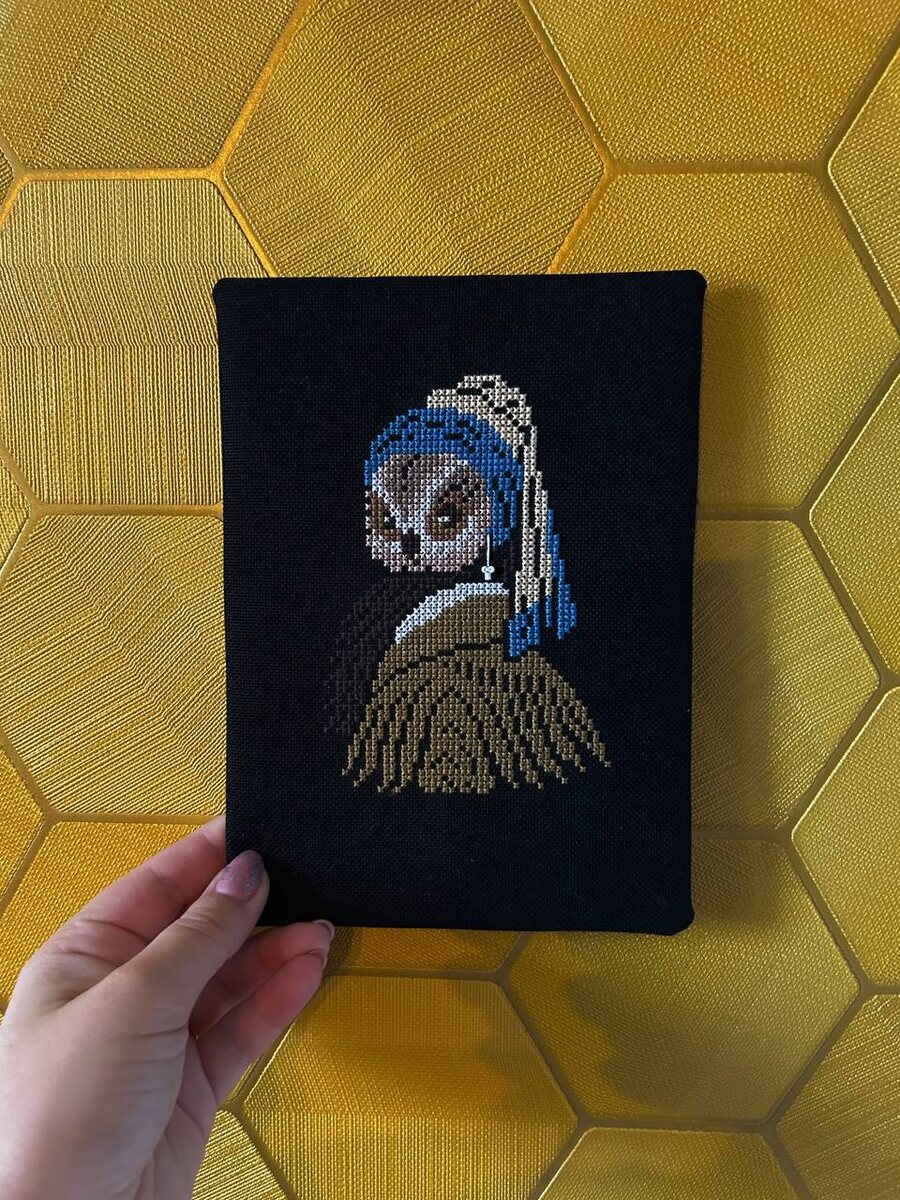 Не могу сказать, что я большой поклонник классической живописи, но не могу отрицать, что сова-то получилась просто очаровательной! Как обычно, всё не по плану: жемчужной сережки у меня не было, времени ждать очередную доставку с маркетплейса тоже не было, поэтому я пришила рубку и 2 бисеринки. Помимо этого я доблестно не нашла нужный цвет для шейного платка (это же шейный платок), вышила темным, а потом цвет нашла, но пороть - удел слабых (шутка), поэтому живем с тем, что есть. С другой стороны, разве все эти мелочи не делают вышивку особенной? Каждую вышивку особенной. Важный нюанс: я подозревала, что сфотографировать работу на черной канве еще сложнее, чем вышить. Так и вышло. На первом фото цвета темнее, чем я вижу их в жизни, на втором, после технических деталей, они чуть-чуть ярче, чем в жизни. Поверьте мне на слово, сова получилась волшебной.