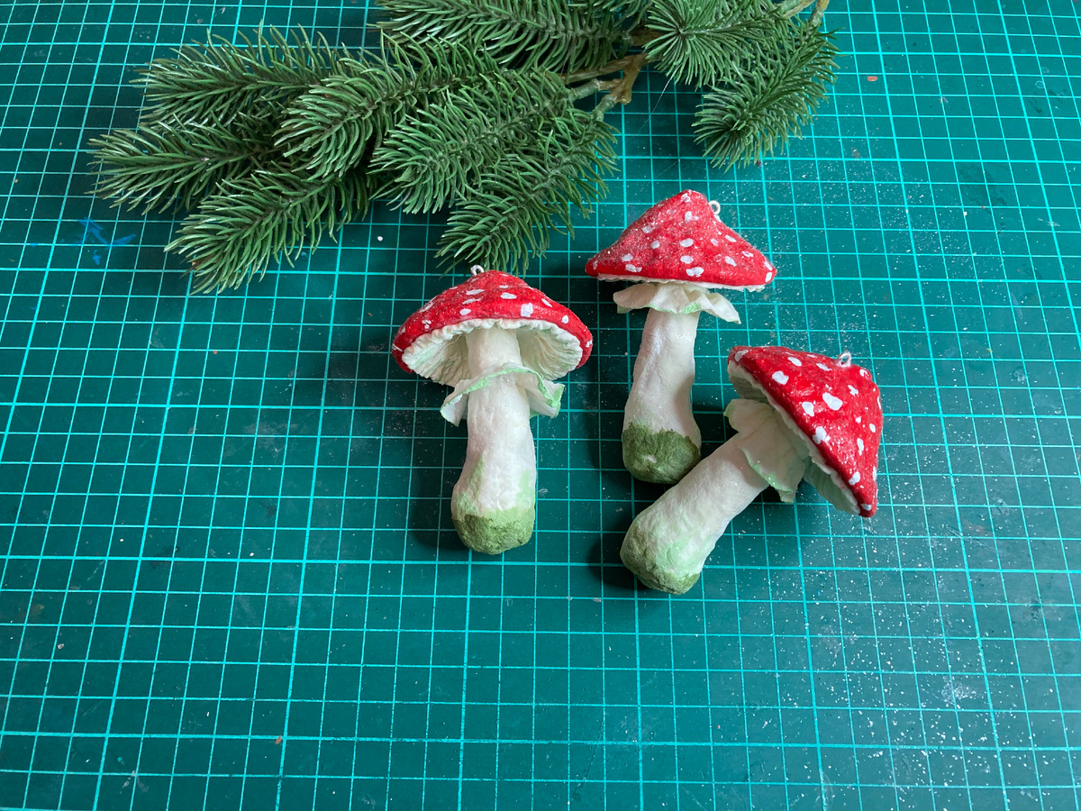 Приветствую вас, Друзья! Прошлый раз, я рассказала вам, с чего начинается работа над яркими мухоморами на новогоднюю елку. Думаю, что вам понравилось работать с фольгой и это совсем не сложно. Заготовки для грибов у вас получилось сделать? Сегодня работаем далее. Сначала следует обкрутить все заготовки для ножек грибов. Таким образом вам будет легче понять принцип работы с ватой. Полоской ваты равномерно обкручиваем заготовку из фольги, в случае необходимости, мелкие проплешины можно закрыть небольшими кусочками ваты. А затем ниткой закрепляем вату на заготовке как можно равномернее. Лучше сразу выполнить эту операцию со всеми заготовками ножек, так как вата не прилипает к сухим рукам. Затем, с помощью кисти пропитываем вату рабочим раствором клея ПВА. Руками выглаживаем неровности на поверхности заготовки из фольги и выгоняем остатки воздуха из-под ваты. Затем тщательно выравниваем поверхность заготовки небольшими кусочками ваты в технике папье маше. При необходимости, опять выглаж