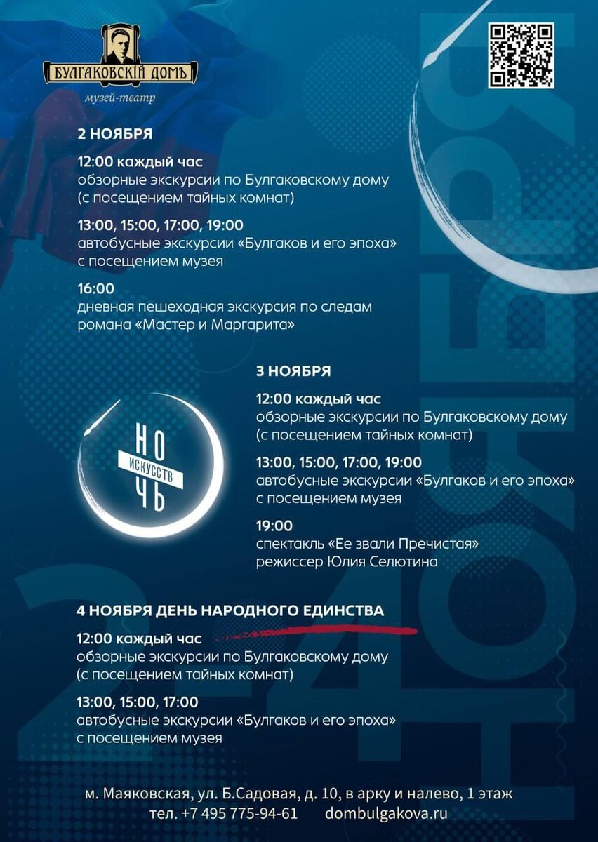 Акция «Ночь искусств» – это продолжение международной акции «Ночь музеев». Первая акция прошла в 2013 году. Акция направлена на популяризацию культурного досуга и на знакомство с произведениями искусства с необычного ракурса. 🔵 «Ночь искусств» также приурочена к празднованию «Дня народного единства», который состоится завтра, 4 ноября. В эти три праздничных дня мы работаем и ждем вас. 3 ноября 12:00-20:00 обзорная экскурсия по музею; 13:00, 15:00, 17:00, 19:00 городские экскурсии на «Трамвае 302-БИС»; 19:00 спектакль «Ее звали Пречистая». Билеты: https://clck.ru/3Q5YdY 4 ноября 12:00-20:00 обзорная экскурсия по музею; 13:00, 15:00, 17:00 городские экскурсии на «Трамвае 302-БИС». Билеты: https://clck.ru/3Q6Bmi ☕️ Приходите провести день с Михаилом Афанасьевичем Булгаковым! Ждем вас с 12 до 20 на Большой Садовой 10. #ночьискусств #ТеатрБулгакова