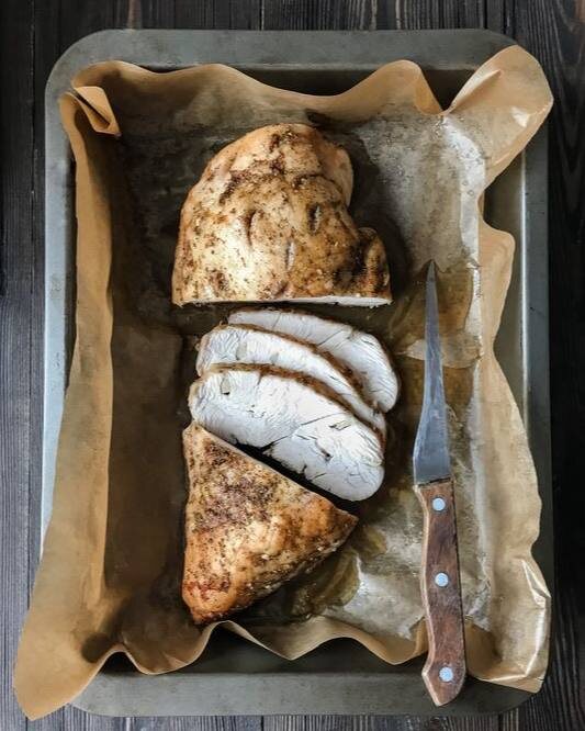 ПП-буженина из индейки или курицы Ингредиенты • Грудка индейки или куриная грудка – 1 кг • Чеснок – 4–5 зубчиков • Соль – 1 ч. л. • Чёрный молотый перец – 0,5 ч. л. • Паприка, кориандр, сушёный чеснок (по желанию) – по 0,5–1 ч. л. • Растительное масло – 1 ст. л. Приготовление 1. Промыть и обсушить мясо. 2. Измельчить чеснок. 3. Смешать соль, перец, специи и чеснок. 4. Натереть смесью грудку со всех сторон. Оставить на 30–60 минут. 5. Форму смазать маслом или застелить пергаментом. Выложить мясо. 6. Разогреть духовку до 220 °C. 7. Поставить мясо и запекать 35-40 минут. 8. Не открывая дверь, выключить духовку и оставить мясо внутри на 2 часа. За это время оно дойдёт до готовности и останется сочным. Подача и хранение • Нарезать после остывания тонкими ломтями. • Хранить 3–4 дня в холодильнике в плотно закрытом контейнере. 👌🏻 Это прекрасная замена колбасным изделиям, которую можно использовать в повседневной жизни, например, для бутербродов к завтраку.