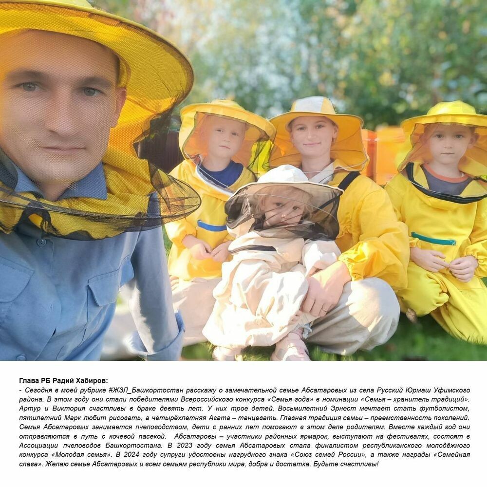 Глава РБ Радий Хабиров в соцсетях в рубрике #ЖЗЛ_Башкортостан рассказал о семье Абсатаровых из села Русский Юрмаш Уфимского района Башкирии. Как рассказал руководитель региона в соцсетях, семья Абсатаровых победила в конкурсе «Семья года» в номинации «Семья – хранитель традиций», Артур и Виктория Абсатаровы счастливы в браке девять лет и у них трое детей. Все они занимаются пчеловодством, участвуют в районных ярмарках и выступают на фестивалях, состоят в Ассоциации пчеловодов РБ.