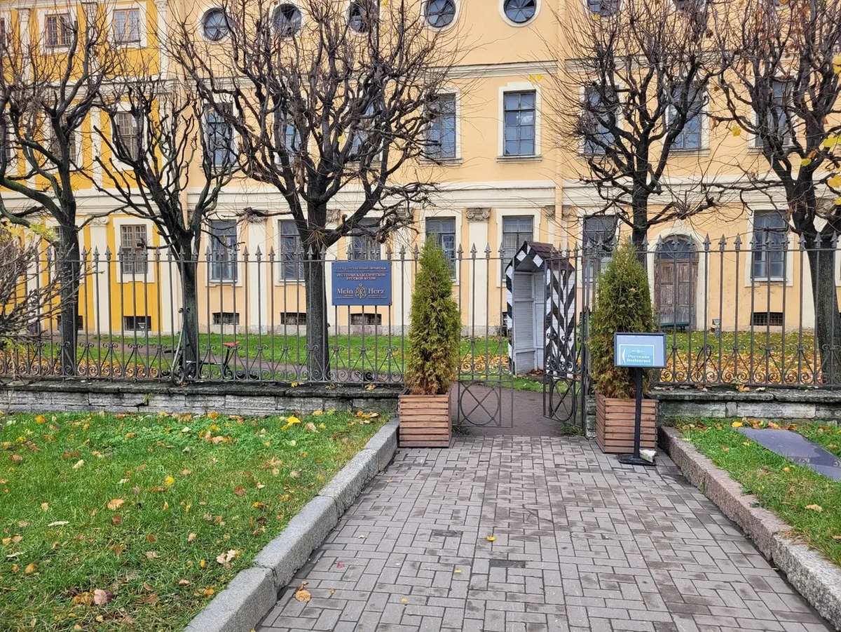 Если идти от Стрелки, тут все логично - табличка у входа, открытая дверь в ограде сада, не перепутать. Если же свернуть на набережную со Кадетской, то сперва увидите главный вход в музей - и там тоже будет баннер ресторана, так что появится искушение зайти, но через музей вы в ресторан не попадёте.