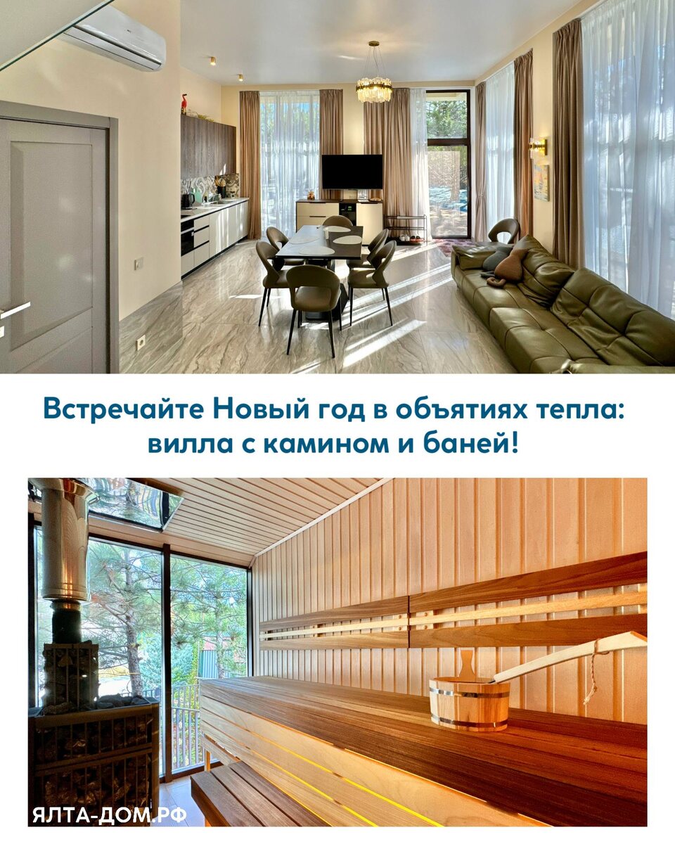 ✨ Встретьте Новый год у подножия Ай-Петри, в собственном коттедже с бассейном, банькой и уютом, о котором мечтает каждая компания друзей. 🏡 Комплекс вилл приглашает провести праздники красиво и по-домашнему — в одной из четырёх вилл премиум-класса, праздничная атмосфера и все необходимое для идеального отдыха гарантированы. 💦 Подогреваемый бассейн — купайтесь даже зимой. 🔥 Баня — то, что нужно после прогулок и вечеринок. 🌲 Терраса с панорамным видом на горы. 🍡 Мангал и крытая беседка. 🛏 Идеальные спальни с ортопедическими матрасами и подушками и оборудованная кухня. 🎉 Стоимость проживания с 31 декабря по 3 января: — 40 000 ₽/сутки для 4 гостей — 44 000 ₽/сутки для 5 гостей — 46 500 ₽/сутки для 6 гостей (Большая вилла — от 49 000 ₽) 💥 При бронировании до 15 ноября — действуют текущие цены, потом повышение! А с 3 по 11 января — скидка 10% при раннем бронировании (за 30 дней). Можно арендовать весь комплекс целиком — до 25 человек. Идеально для большой компании или семьи ❤️