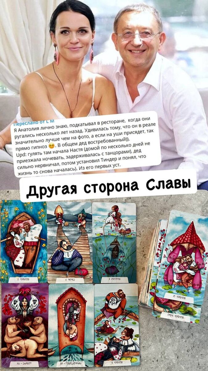 Не просто так имя Анастасия происходит от греч. воскресение, символ новой жизни, духовной силы. Сколько примеров: Заворотнюк, Волочкова, Ивлеева, Стоцкая… у всех непростые жизненные истории. Вот и Анастасии Сланевской, известной под псевдонимом СЛАВА, слава далась не просто за красивые глаза. *Надо сказать, что мне Слава нравится, поэтому уж не обессудьте где-то расклад будет комплиментарным, но так мало прямолинейных людей в шоушизе. Да и талантом и красотой не обделена. ❤️Любила/любит ли своего Толика? Были времена, как она и сама сказала, когда по Дьяволу в Данилицком, молодая певица увидела возможности в безбедную жизнь, но позже любовь пришла, вот только семейного счастья не случилось. Анатолий классический кобельЁн, влюбчивый и «вечно молодой» (2 кубков, 2 мечей), одной женщины такому мало. Бесконечный адюльтер, Слава пыталась искоренить и рождением общего ребенка, но по аркану Повешенный, сами понимаете, ничего не вышло. 💔Страдала ли она от его измен или изменяла в ответ? Да