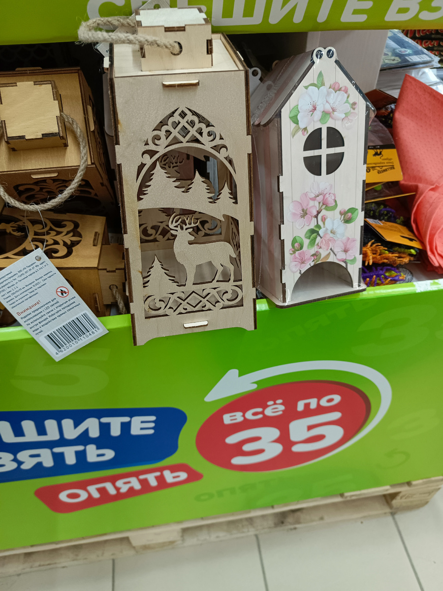 В "Фикс Прайс" можно заметить полки с товарами по 35 рублей, которые особенно привлекают внимание покупателей. На них представлена разнообразная мелочь, ранее стоившая в два-три раза дороже, но теперь уценённая до 35 рублей. Однако в магазине также появилось множество новинок, на которые я обратила внимание. И в этом обзоре, делюсь с вами увиденным в "Фикс Прайс" города Крымск. Два изделия из дерева. 1. Подставка для пакетиков чая выполнена в виде уютного домика с крышей и окраска в теплых и нежных тонах, что создает атмосферу домашнего уюта. В него удобно складывать пакетики чая. 2. Декоративный фонарь для светодиодной свечи, можно поставить на стол или подвесить. Это новогодний аксессуар, который будет превосходно смотреться в праздничном интерьере. Новогодний фонарик - стильный, оригинальный элемент праздничного оформления. Фоторамка 21х30 см — это стильный и удобный способ хранить воспоминания о самых ярких моментах жизни.