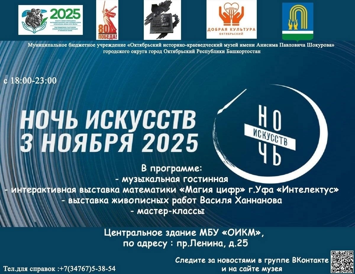 3 ноября в Октябрьском историко-краеведческом музее им. А. П. Шокурова пройдёт всероссийская образовательная акция «Ночь искусств - 2025». В программе горожан ожидают мастер-классы по бисероплетению, вышивке по фетру, интересные выставки и музыкальные выступления. Учащиеся детской школы искусств № 2 проведут музыкальную гостиную, ветеран нефтяной промышленности Пётр Лаптев расскажет о связи поколений. Музыкальные номера покажут участники молодёжного объединения Дворца молодёжи «Искра». В 22.30 в музее состоится традиционное мероприятие «Спокойной ночи, Лита!», посвящённое древним жителям, проживавшим на территории Октябрьского в эпоху бронзы. Вход на мероприятие — по входным билетам и пригласительным. Бесплатно с предоставлением удостоверяющих документов «Ночь искусств» могут посетить военнообязанные, участники СВО и члены их семей, малоимущие, многодетные и люди с ограниченными возможностями здоровья. Акция пройдёт в центральном здании музея по адресу: пр. Ленина, 25. Начало — в 18.00