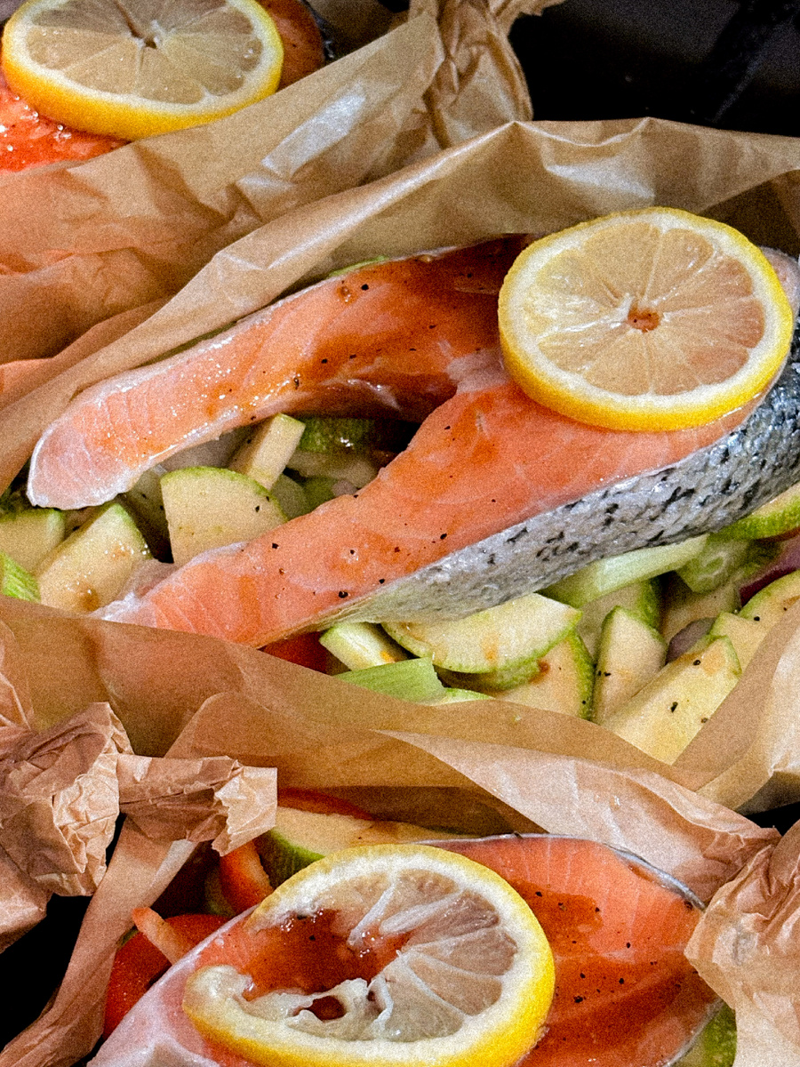 Ужин в стиле "но-стресc"? Легко! 🐟✨ Знакомо чувство, когда после долгого дня хочется чего-то вкусного, но сил на готовку нет? Этот рецепт — ваш новый лучший друг! Стейки лосося с хрустящими овощами, которые готовятся в духовке БЕЗ грязной посуды. Да, вы не ослышались! Всё запекается в пергаментных лодочках — максимум вкуса, минимум уборки. 🥰 Почему это идеально: ✅ Быстро (20-25 минут) ✅ Полезно (белок + витамины) ✅ Красиво (можно подавать прямо в лодочках) ✅ Ароматно (все соки остаются внутри!) Что нужно (на 4 порции): · Стейки лосося — 4 шт. · Кабачок — 1 небольшой · Помидоры черри — 10-12 шт. · Корень сельдерея . Фиолетовый лук . Болгарский перец(по половинке красного и желтого) · Лимон — несколько долек · Оливковое масло, соль, перец, прованские травы (или укроп) — по вкусу · Пергамент силиконизированный для выпечки — 4 больших листа Шаги к идеальному ужину: 1. Готовим "лодочки": Разогреваем духовку до 200°C. Большие листы пергамента смазываем в центре оливковым маслом. 2.