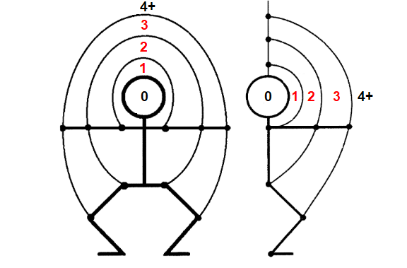 Схема корректируемых уровней внешнего пространства тела человека 0 - Вегетативный - тело человека 1 - Рефлекторный - тело условно "живое" или "неживое". Где есть рефлексы, там тело "живое", где нет рефлексов - там только автоматизмы, то есть роботизированность. 2 - Сенсо-моторный - кожа, то есть границы тела. Когда кожные анализаторы в порядке, мозг "видит" границу тела. Когда же анализаторы не работают, то мозг физически растягивает кожу, что бы она давала сигналы физического растяжения для определения границ тела, то есть пользуется другим способом контроля границ, как бы работает на другой частоте. Для растяжения кожи мозг увиличивает объем тела, а это "лишний вес". 3 - Эмоционально-волевой - управление телом с помощью кнута и пряника. Кнут - отрицательные эмоции (уход во пространство внутреннего мира с уменьшением пространства внешнего мира), пряник - положительные эмоции (самокоррекция) (смотри статью "Воля и эмоции"). Почему уровни называются корректируемыми? - Они поддаются кор