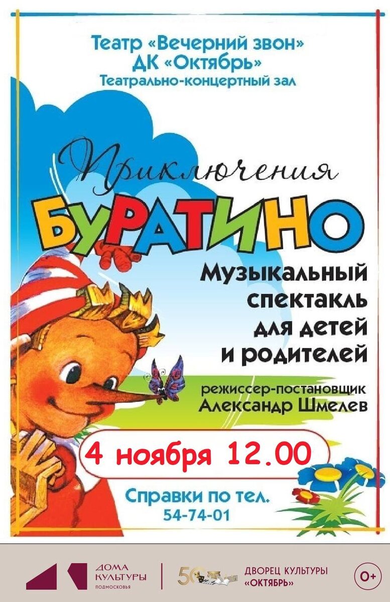 ✨ Приключения Буратино ⭐️Театр «Вечерний звон» приглашает 👉Яркие костюмы, танцы и оригинальная музыка – это поучительная история о добре, настоящей дружбе и преданности. 🚫 Возраст: 0+ 📆 04.11.2025 🕒 12:00 🏢 Дворец культуры «Октябрь» 📍 г. Подольск, ул. Свердлова, д.38 💰 Цена от: 500 до 900 ₽ ⭐Поддержать канал голосом 💰 Вакансия - курьер в Подольске ✅ Мероприятия Подольск https://dzen.ru/id/66ed500f7b5671493eca3fd6 http://vk.com/podolsk_events http://dzen.ru/podolsk_events