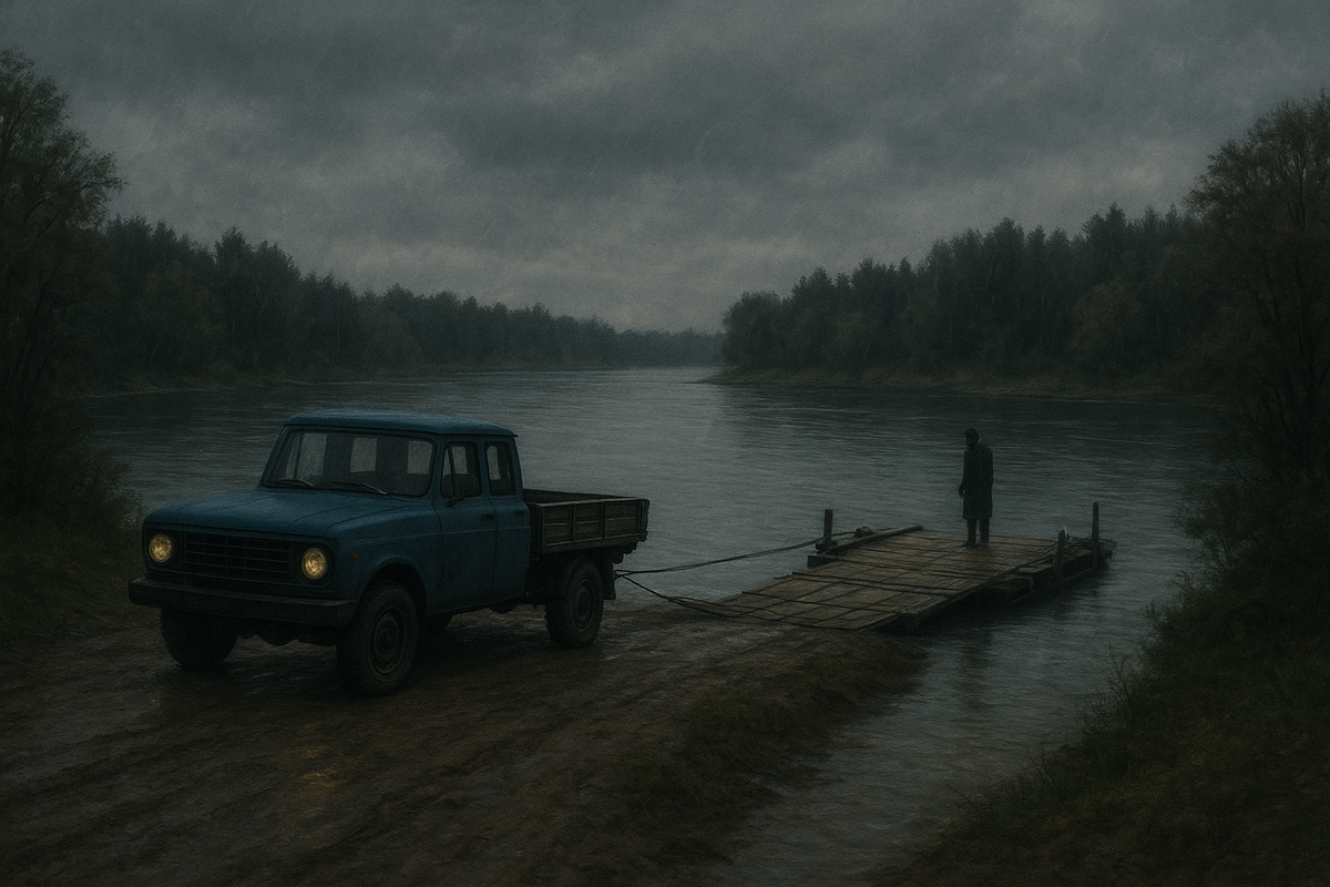 Вечером вышли к броду, где раньше паром ходил. В картах написано — переправа старая, но неглубоко. Ночь, фонари почти сели, комары, холодная вода блестит.