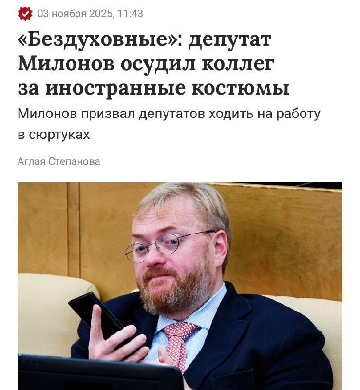 🎩 Милонов предложил вернуть депутатам сюртуки и френчи вместо «бездуховных» иностранных костюмов