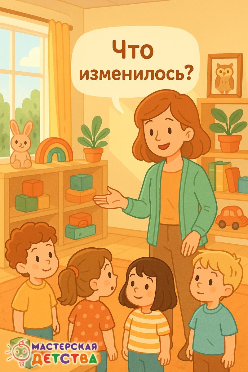 👀 Мини-урок для воспитателей Игра-наблюдение «Что изменилось в группе?» Развиваем внимание и память. Эта простая, но очень увлекательная игра помогает детям учиться замечать детали, сравнивать и удерживать в памяти информацию, то, что напрямую связано с развитием наблюдательности и мышления. 🎲 Как провести игру 1️⃣ Подготовка: Попросите детей внимательно осмотреть группу: игрушки, книги, мебель, предметы на полках. 2️⃣ Изменения: Попросите их закрыть глаза или отвернуться, а сами поменяйте что-то одно: – переставьте предмет – уберите игрушку – замените картинку на стенде – поменяйте цвет салфетки или местами стулья 3️⃣ Наблюдение: Дети открывают глаза и стараются заметить, что изменилось. 4️⃣ Обсуждение: — «Как ты понял, что это не так, как было?» — «Что помогло вспомнить?» Можно играть командами или индивидуально, увеличивая количество изменений по мере роста интереса. 🌿 Что развивает игра ✔️ произвольное внимание и зрительную память ✔️ умение сравнивать и логически рассуж