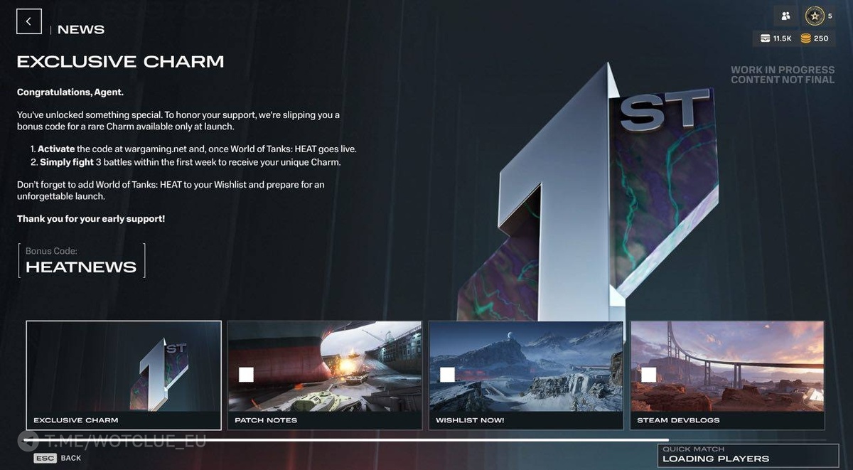 Бонус-код: HEATLSP Код можно активировать на любой аккаунт, даже если у вас нет доступа к супертесту (Lodestar) WoT: Heat. Задача должна появится после релиза игры (или, возможно, чуть раньше). Даёт: Награда: Условие: Вводить тут (нужно войти в аккаунт): https://wargaming.net/shop/redeem/?bonus_mode=HEATLSP 1 раз на аккаунт. Для всех регионов.