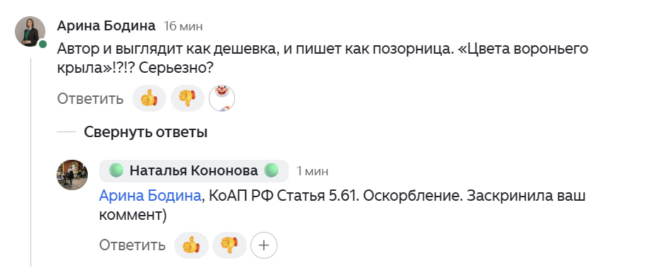 Сегодня под моим материалом произошла ситуация, которую я не могу оставить без внимания. В комментариях появилась пользовательница, которая решила выразить своё несогласие не с аргументами, не с фактами и даже не со стилем, а с моей внешностью и личностью. Её слова были: «Автор и выглядит как дешевка, и пишет как позорница. "Цвета вороньего крыла"!?!? Серьезно?» Абсурдность этой претензии поразительна. Мне жаль, что глубокие метафоры, обозначающие красивый, иссиня-черный цвет, вызывают у человека такую острую негативную реакцию. Видимо, её словарный запас ограничивается более простыми прилагательными, в отличие от штрафных санкций КоАП. Но вместо того, чтобы опускаться до взаимной грубости и «кормить тролля», я решила ответить иначе — через призму закона и просвещения. КоАП РФ Статья 5.61. Оскорбление. Хейт в сети — это не просто "свобода слова". Мы часто забываем, что интернет — это такое же общественное место, как улица или офис. Здесь действуют те же правила и законы, что и в реал