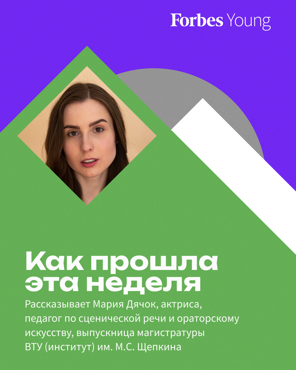 Сегодня в рубрике «Как прошла эта неделя» о своей жизни рассказывает 22-летняя актриса, педагог по сценической речи и ораторскому искусству Мария Дячок. Как прошла твоя неделя? Были кинопробы. Встречалась с потенциальными партнерами моего небольшого бизнеса. Чем ты занимаешься? Снимаюсь в фильмах и сериалах. Веду индивидуальные занятия по ораторскому искусству. Также у меня есть киношкола для детей и подростков. С чего начался твой путь в профессию? Я занималась в детской студии при театре. В девятом классе меня заметил мастер нашего саратовского театрального института и предложил через год поступать к нему в мастерскую. Окончила школу экстерном — и в 16 лет поступала в театральные институты Москвы, Питера, Саратова и Ярославля (в каждом вузе по пять-семь вступительных туров). В итоге выбрала учебу в Москве. Что самое крутое и что самое тяжелое в твоей работе? В актерской профессии есть творческое самовыражение и катарсис. Я позволяю себе гораздо больше, чем в жизни, глубже