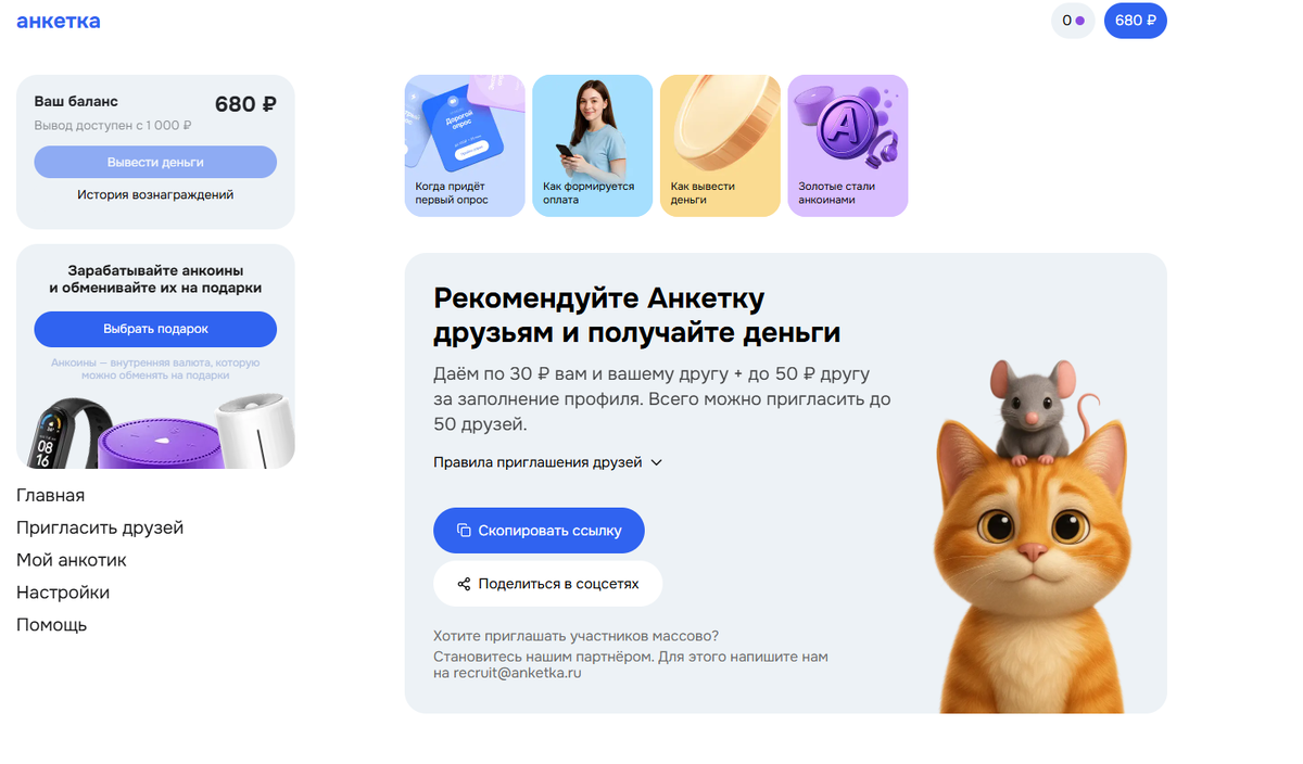 Если вы не зарегистрированы на Анкетке, то предлагаю сделать это по моей реферальной ссылке - https://www.anketka.ru/referral/14987535. При регистрации по ней и вам, и мне придёт по 30 рублей. Если заполните анкету, то ещё 50 рублей.