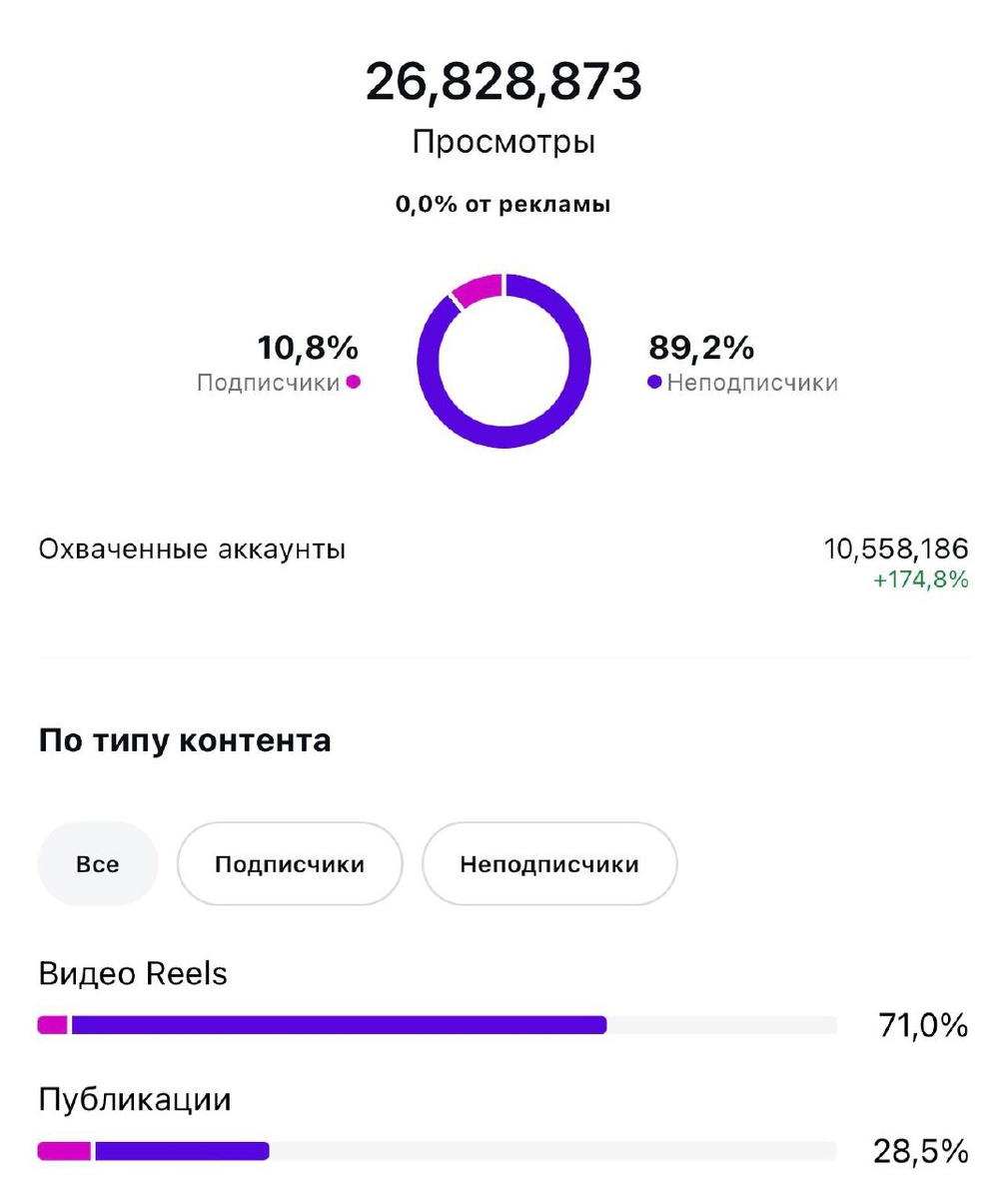 Реклама больше не дает результат🤷🏻♂️ Ты можешь тратить сотни тысяч рублей в месяц на трафик, но если у тебя не выстроена система работы с аудиторией, то результат получат лишь 5-10%. Все же остальные просто сливают деньги в трубу, надеясь, что «в этот раз точно выстрелит». Но не выстреливает. Потому что реклама не панацея. Она не спасёт, если человек не понимает, кто ты, почему тебе можно доверять и зачем ему покупать именно у тебя. Сегодня всё решает контент. А именно органика, которая без больших временных затрат и бюджета, может дать невероятный результат! Взгляните на аналитику моего канала: 80% нового трафика приходит благодаря органическому контенту! И знаешь, почему это работает? Сегодня самый популярный формат нейро-контент, который создается за 5-10 минут с триггерным заголовком через ИИ. Мои ученики уже набирают миллионы просмотров и привлекают аудиторию благодаря этой системе. Я вообще верю в то, что в ближайший год-два, большая часть контента будет создана нейросе