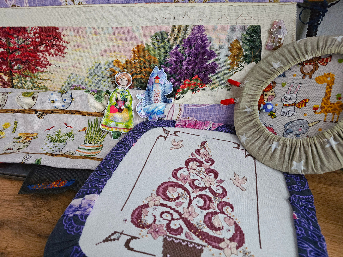 Зимние мумики из журнала "Время вышивать". Мумика "Уютный вечер" я вышила ещё в начале года, а муминку "Морозное утро" почти закончила летом. Но мне там не хватило одного цвета, поэтому бэк у меня подвис.