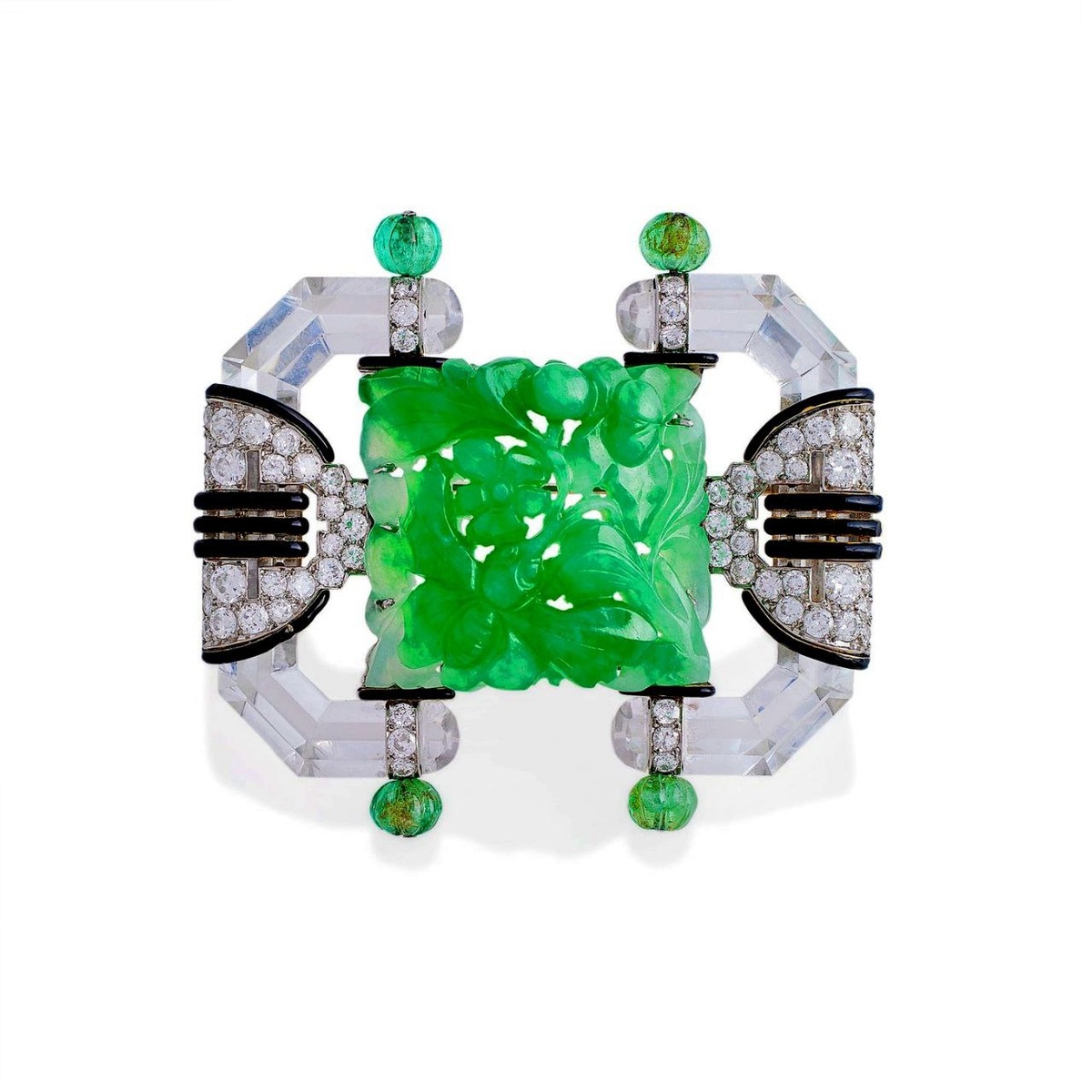 ⚘️Роскошная брошь от Mauboussin Paris 1930-1935гг. - еще один замечательный образец стиля Ар деко. Изящный растительный орнамент огранки жадеита контрастирует с подчеркнутой лаконичностью геометрических форм пластин горного хрусталя, сдержанным блеском тонких линий чёрной эмали и холодными росчерками бриллиантов... Подобный подход к огранке камней - в виде листьев и цветов - использовался в одной из самых известных коллекций Cartier - Tutti frutti, также возникшей в этот период. Ар деко стремился соединить в себе все и сразу: роскошь и лаконичность, стремительность новой эпохи, её практичность и восточный колорит, а также эстетику древних культур, но главное - он стремился воплотить нарочитую декоративность, ставшую не просто визитной карточкой "последнего большого стиля", но и давшую ему название. Еще больше об эпохе ар деко можно узнать из отдельной подборке на канале.