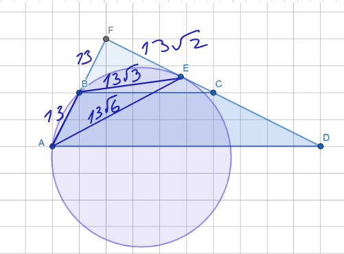 касающейся прямой CD, если AB = 13. Лично мне пришло на ум искать радиус окружности, описанной около треугольника BAE. Значит будем применять расширенную теорему синусов. А это значит нужно найти все его стороны. В моем решении будет много прямоугольных треугольников. Продлим AB и CD до их пересечения в т. F Рассмотрим треугольник FAD. Тогда FA = 26 Теперь я увидела касательную и секущую выходящие из одной точки F. А значит, Когда все стороны найдены, применяем теорему синусов. Конечно, есть и другие решения у этой задачи. Надеюсь вам мое решение понравилось Буду рада вашим комментариям, лайкам и подписке на канал Спасибо за внимание, до новых встреч.