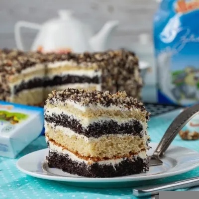 ДВУХЦВЕТНЫЙ ТОРТ . Ингредиенты: Для коржей: 6 шт.- яиц 400 гр.- сахара 400 мл.- сметаны 1 ч. л.- соды 1 ч. л.- уксуса 10% 2 ч. л.- разрыхлителя Для белого коржа: 180 гр.- муки Для темного коржа: 120 гр.- муки 40 гр.- какао порошка Для крема: 200 гр.- сливочного масла "Деревенское" 400 гр.- сгущенного молока Приготовление: 1.В большой миске взбить до бела яйца и сахар. Добавить сметану. Перемешать. 2.В соду влить уксус и добавить яично-сметанную смесь. Перемешать. 3.Смесь разделить пополам и разлить в две чаши. 4.В одну часть добавить 180 г муки + 1 ч. л разрыхлителя, перемешать. 5.Во вторую часть добавить муку, какао и оставшийся разрыхлитель. 6.Противень застелить бумагой и поставить немного под наклоном. 7.Вылить сначала один вид теста, распределить его по половине противня. 8.Затем поставить противень ровно и вылить вторую часть теста. 9.Отправить в духовку разогретую до 180*С на 25 минут. 10.Готовый корж остудить и разрезать на черный и белый корж, а затем еще каждый ко