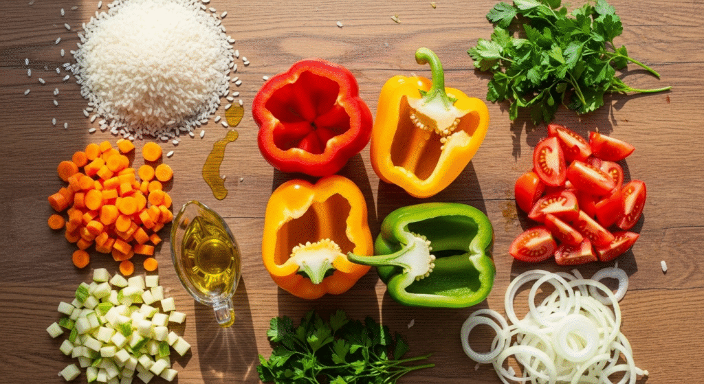 Фаршированный болгарский перец с рисом и овощами — это простое и сытное блюдо. Оно сочетает сочный перец, мягкий рис и ароматные овощи. Готовится быстро, выглядит ярко и подходит для любого случая. Болгарский перец пришёл в Европу из Америки в XVI веке. С тех пор его используют во многих кухнях мира. Перцы ценят за вкус и насыщенный цвет. Чтобы приготовить фаршированный болгарский перец с рисом и овощами, нужны простые продукты. Возьмите 6 крупных перцев, 1 стакан риса, 1 луковицу, 1 морковь, 1 цукини, 2–3 помидора, зелень, соль и немного масла. Эти ингредиенты легко найти, а результат радует даже новичков. Сначала отварите рис до полуготовности. Затем нарежьте лук, морковь и цукини. Обжарьте овощи на масле до мягкости. После этого добавьте помидоры и тушите ещё несколько минут. Теперь смешайте овощи с рисом, зеленью и специями. Получившуюся смесь используйте как начинку. Аккуратно срежьте верхушки перцев и удалите семена. Наполните перцы начинкой и поставьте их в форму. Налейте немног