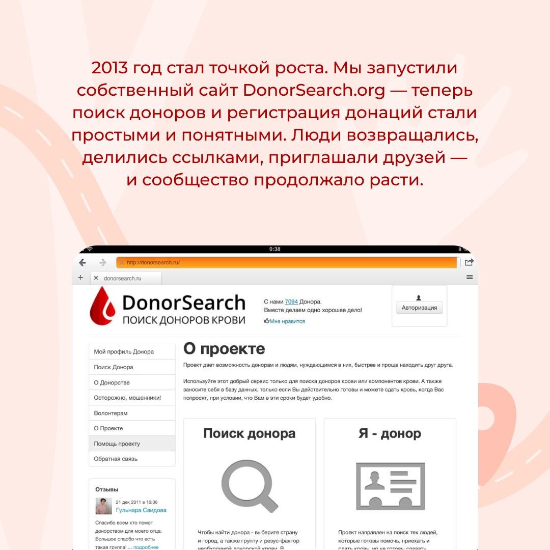 Π ΡΡΠΎΠΉ ΡΠ°ΡΡΠΈ ΠΈΡΡΠΎΡΠΈΠΈ β ΡΠΎΠ·Π΄Π°Π½Π΅ ΠΠΠ, Π·Π°ΠΏΡΡΠΊ ΡΠ°ΠΉΡΠ°, ΠΏΠΎΠ΄Π΄Π΅ΡΠΆΠΊΠ° ΠΎΡ ΠΠ°Π²Π»Π° ΠΡΡΠΎΠ²Π°, ΠΏΠ΅ΡΠ²ΡΠ΅ Π³ΡΠ°Π½ΡΡ ΠΈ ΠΏΡΠ΅ΠΌΠΈΠΈ, ΡΠΊΡΠΏΠ΅ΡΠΈΠΌΠ΅Π½ΡΡ ΠΈ ΠΎΡΠΎΠ·Π½Π°Π½Π½ΡΠΉ Π²ΡΠ±ΠΎΡ ΠΏΡΡΠΈ. ΠΠΌΠ΅Π½Π½ΠΎ ΡΠΎΠ³Π΄Π° ΠΌΡ ΠΏΠΎΡΡΠ²ΡΡΠ²ΠΎΠ²Π°Π»ΠΈ: DonorSearch ΡΡΠ°Π» ΡΠ΅ΠΌ-ΡΠΎ Π±ΠΎΠ»ΡΡΠΈΠΌ β ΠΆΠΈΠ²ΡΠΌ, Π½Π°Π΄ΡΠΆΠ½ΡΠΌ ΠΈ ΠΎΠ±ΡΠ΅Π΄ΠΈΠ½ΡΡΡΠΈΠΌ.