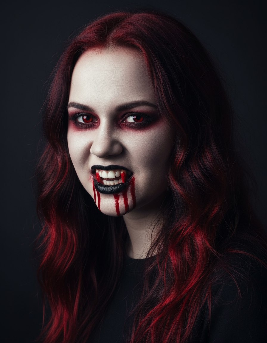 Создай реалистичную крупноплановую фотографию молодой женщины в вампирском стиле: face swap на пользователя, темные волосы с красными прядями, макияж с интенсивными красными smoky тенями вокруг глаз, красные контактные линзы, бледная кожа, черные губы с капающей красной кровью и острыми клыками. Выражение: драматичный оскал с широко открытым ртом, показывающим клыки и кровь, взгляд прямо в камеру с прищуром. Поза: портрет лица в профильное или фронтальное положение, голова слегка наклонена. Одежда: не видна или минимальная, фокус на лице. Окружение: темный фон с легким градиентом, приглушенное освещение, студийная атмосфера без отвлекающих элементов. Стиль: хоррор-реализм, высокая детализация, драматичные тени как в референсе.