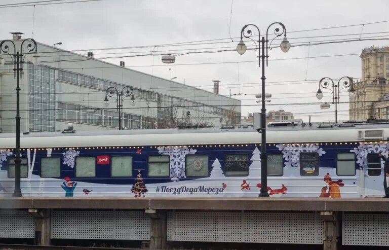 Поезд проехал по Киевскому направлению из Москвы до Калуги и обратно. Наш подписчик успел сфотографировать поезд в момент его отправки в Калугу из Москвы. По расписанию, новогодний состав приехал в Калугу в 12.40, а в обратный путь отправился в 13.20. Планируется, что поезд Деда Мороза будет колесить по просторам России с середины ноября до середины января.