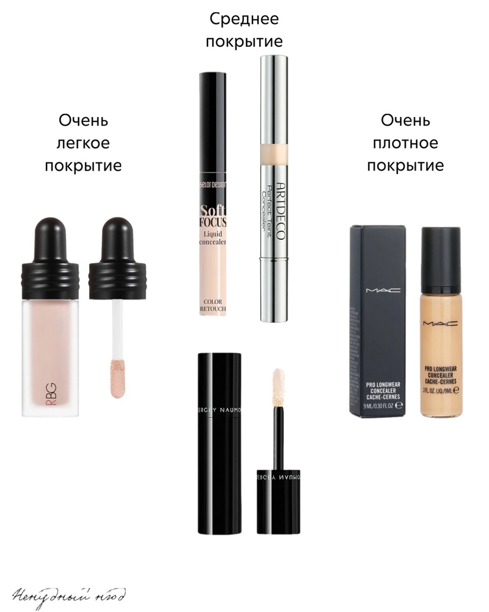 Сразу опровергну миф, что консилером можно скрыть морщинки. Хороший консилер лишь не подчеркнет их. Если у вас нет синих кругов под глазами, вам повезло. А если есть, то просто подбираем подходящий консилер и правильно его наносим: На картинке прекрасные представители подходящих консилеров