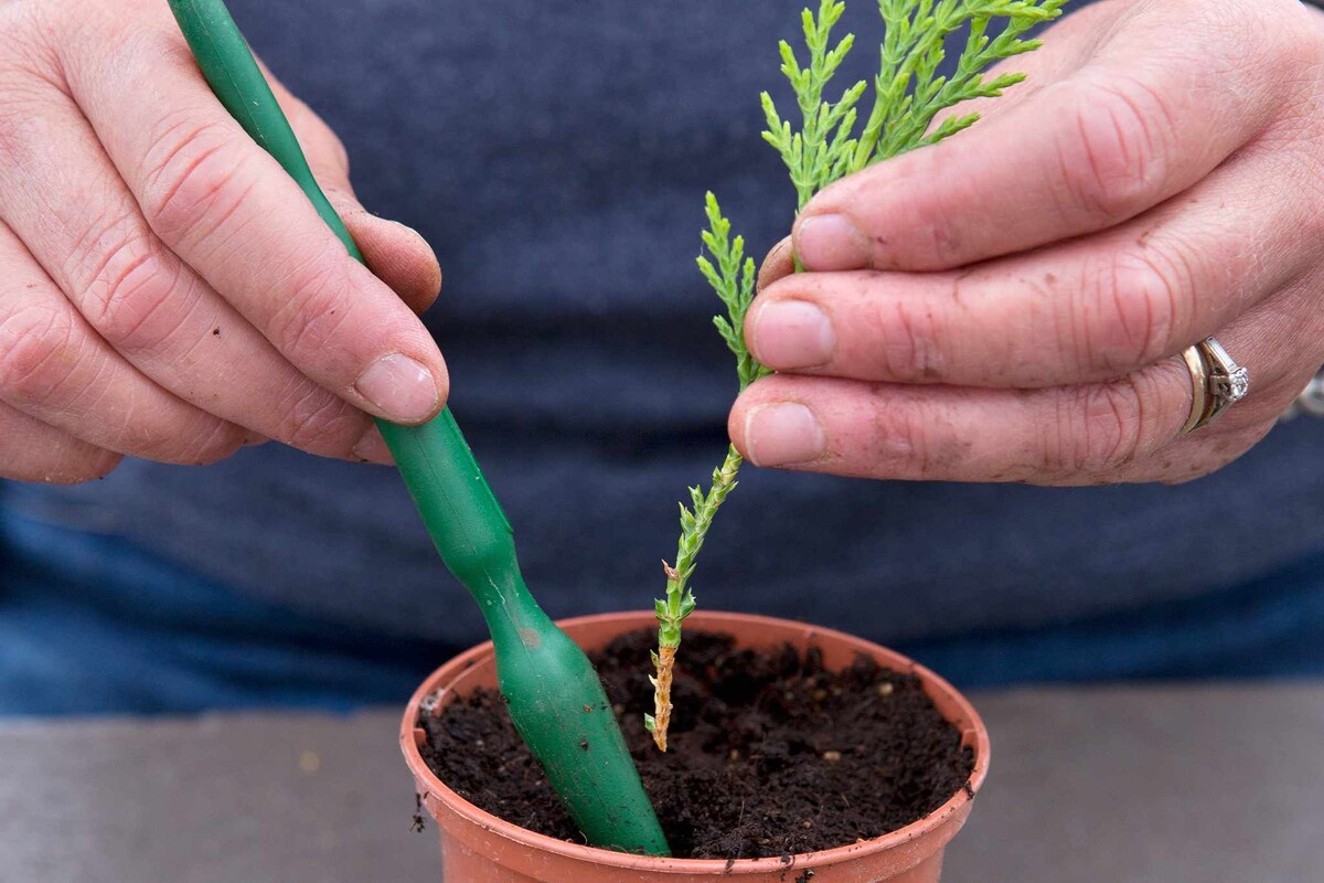 Для улучшения корнеобразования можно опудрить кончики стимулятором, но даже без этого шансы на успех довольно высоки. Черенки хвойных высаживают в контейнеры с дренажными отверстиями, заполненные смесью торфа и песка, и помещают в холодный парник или на неотапливаемую веранду.