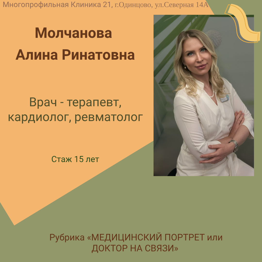 👋 Клиника №21 рада представить нашего нового сотрудника —Молчанову Алину Ринатовну, врача-терапевта, кардиолога и ревматолога. ✨В обязанности Алины Ринатовны входит комплексная диагностика и лечение терапевтических, кардиологических и ревматологических патологий. ✨ ⚠️Обращаем ваше внимание, что для всех пациентов, планирующих плановое хирургическое лечение, теперь доступна услуга предоперационного консультативного приема у терапевта. 💡 Доктор Молчанова проведет оценку соматического статуса, составит план необходимого дообследования и определит готовность к операции, что является важнейшим этапом для минимизации рисков и успешного результата лечения. ✨Молчанова Алина Ринатовна — это не просто врач с дипломом, а специалист с 15-летним стажем, который непрерывно развивается в самых сложных областях медицины. Её образование и карьера говорят сами за себя: ✅Солидное базовое образование и несколько циклов переподготовки по терапии и кардиологии в Южно-Уральском государственном медицинском